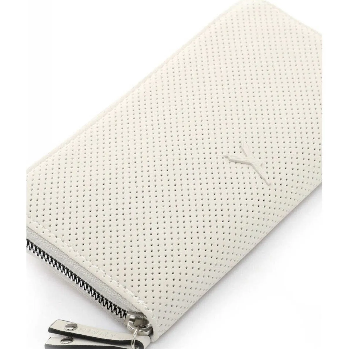 Das Obermaterial wurde aus Kunstleder gefertigt und mit vielen kleinen Lasercuts versehen. Das Portemonnaie lässt sich durch einen umlaufenden Reißverschluss öffnen und schließen. Das Innenleben besteht aus großen Fächern für Geldscheine und zahlreichen kleinen Fächern für Karten und Ähnliches. Für Kleingeld verfügt die Langbörse über ein separates Fach mit Reißverschluss.
