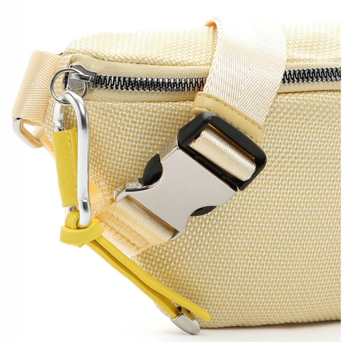 Edel verarbeitetes Nylon in Gelb wurde mit einer zweifarbigen Web-Optik versehen, das der Tasche das gewisse Etwas verleiht. Der Anhänger mit Karabiner Haken und der Logo Print in Gelb runden das Design gekonnt ab.