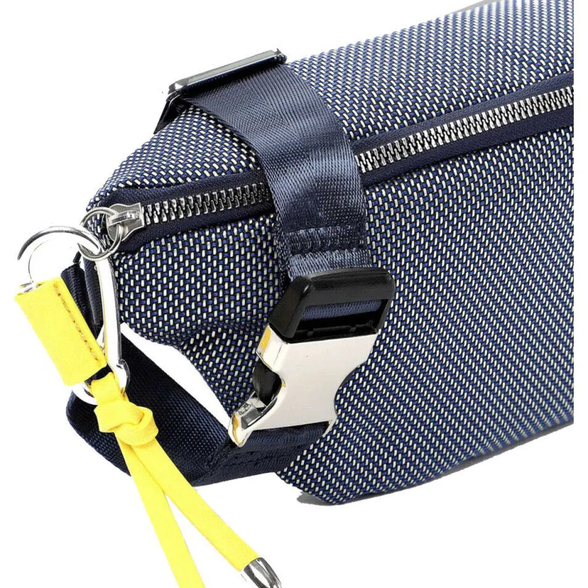 Edel verarbeitetes Kunstleder in Blau wurde mit einer zweifarbigen Web-Optik versehen, das der Tasche das gewisse Etwas verleiht. Der Anhänger mit Karabiner Haken und der Logo Print in Gelb runden das Design gekonnt ab.