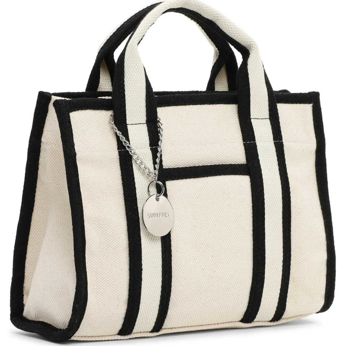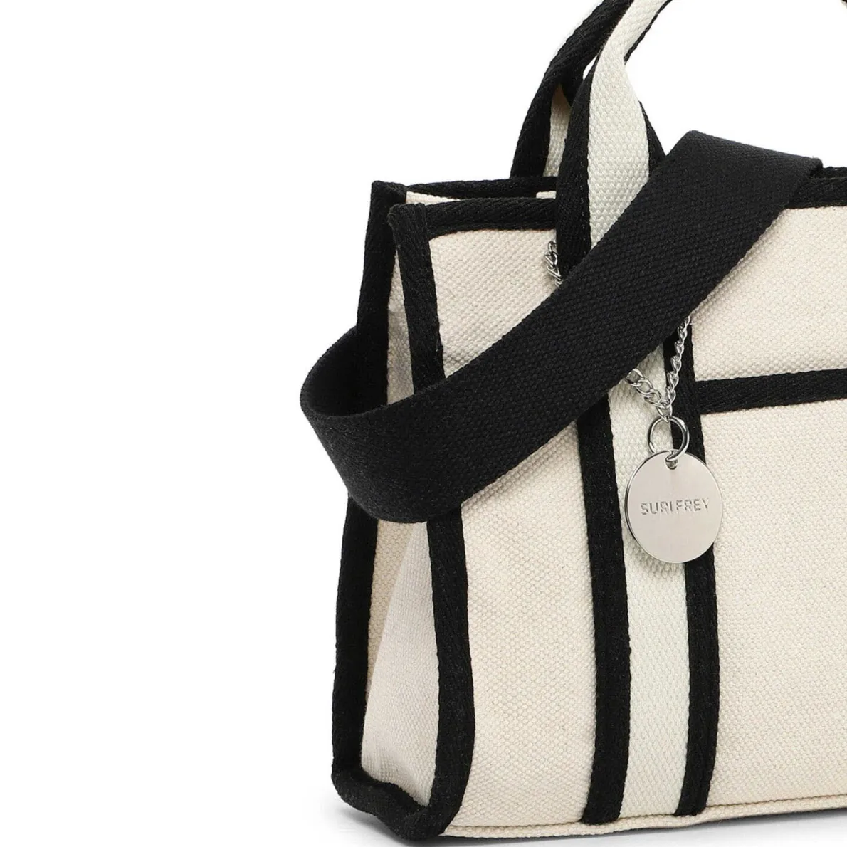 Die Bethany ist eine Damen Henkeltasche von Suri Frey aus hochwertigem Polyester in Beige und Schwarz. Die gewebte Haptik mach die Tasche zu etwas ganz Besonderem. Das Hauptfach kann durch einen Reißverschluss geöffnet und geschlossen werden. Die kleine Handtasche bietet Platz für alle Dinge, auf die du im Alltag nicht verzichten möchtest. Durch den mitgelieferten Canvas Umhängegurt in Schwarz kann die Henkeltasche auch crossover getragen werden.