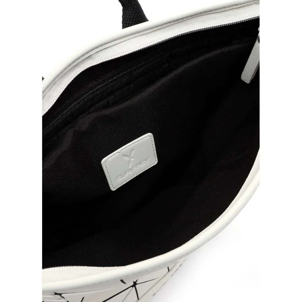 Das Obermaterial aus Kunstleder erhält durch das Geometrische Muster in Ecru Beige eine stylische Mix-Optik und macht den Rucksack zum absoluten Hingucker.