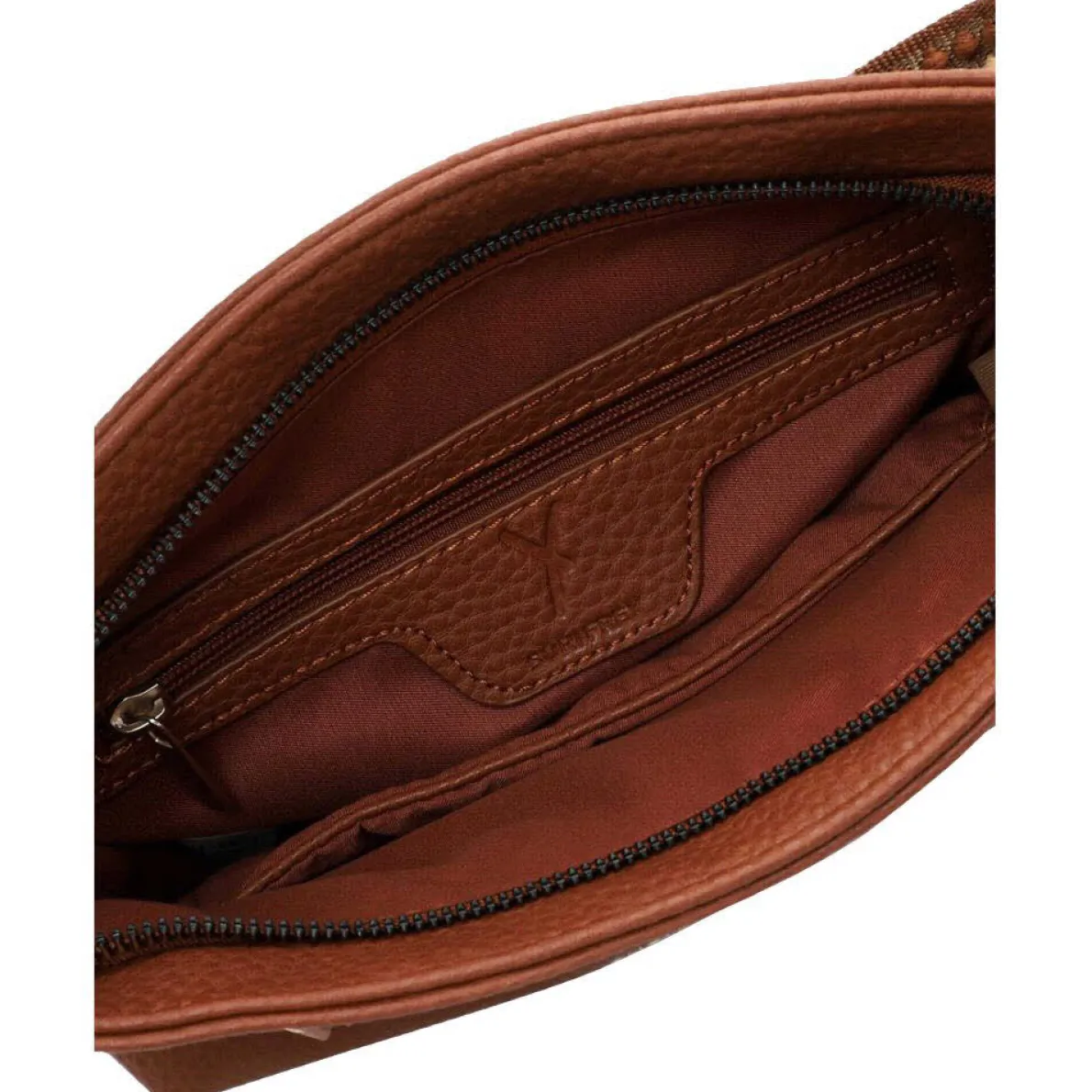 Edel verarbeitetes Kunstleder in Cognac Braun wurde mit einer angenehmen Haptik versehen, die der Umhängetasche das gewisse Etwas verleiht. Das Markenlogo in Gold an der Vorderseite gibt der Tasche einen edlen Look. Durch den verstellbaren Textil Umhängegurt mit angesagtem Muster kannst du die Tasche auch crossover tragen.