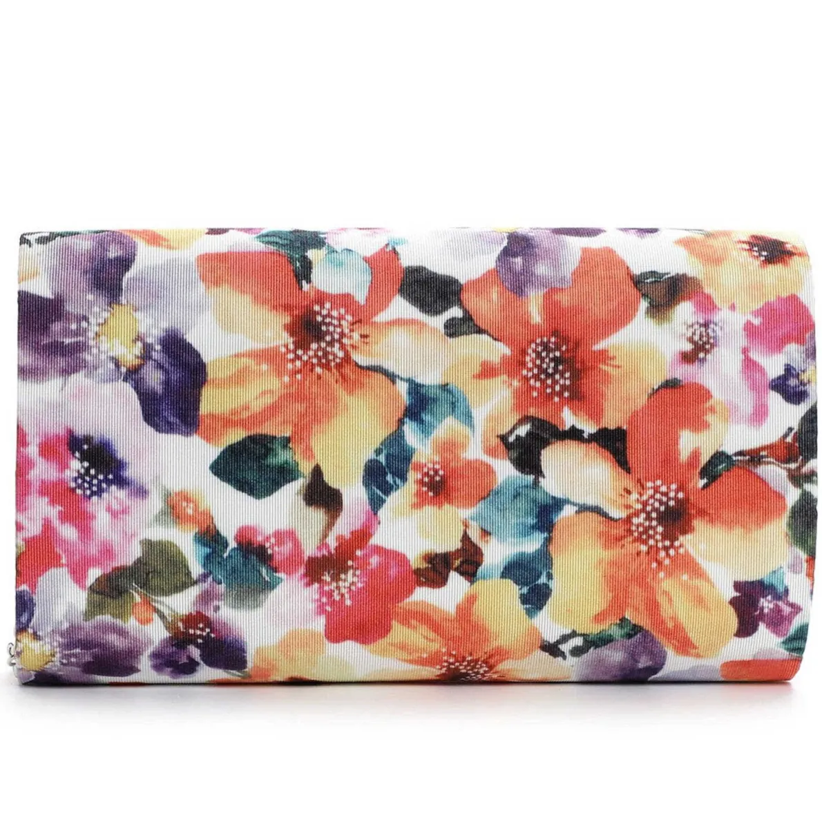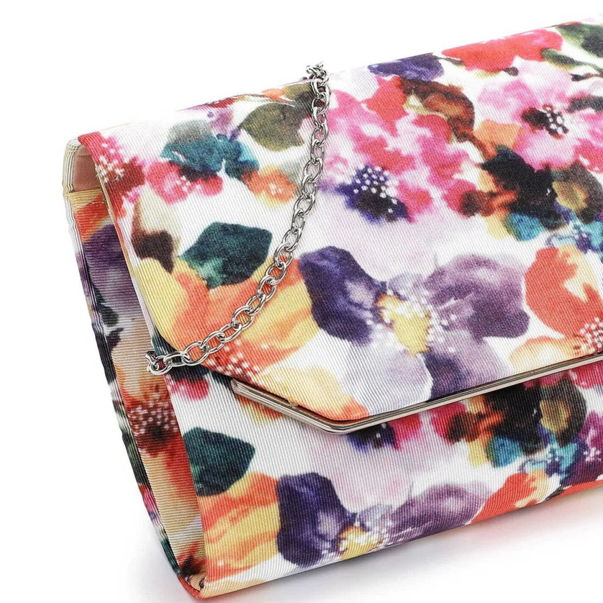 Das Obermaterial aus Textil mit einem farbenfrohen Blumenmuster gibt der Abendtasche noch den letzten Schliff. Durch die stilvolle und abnehmbare Kette kann die Damen Handtasche auch über der Schulter getragen werden. In dem kleinen Hauptfach findet das Notwendigste für den Abend Platz.