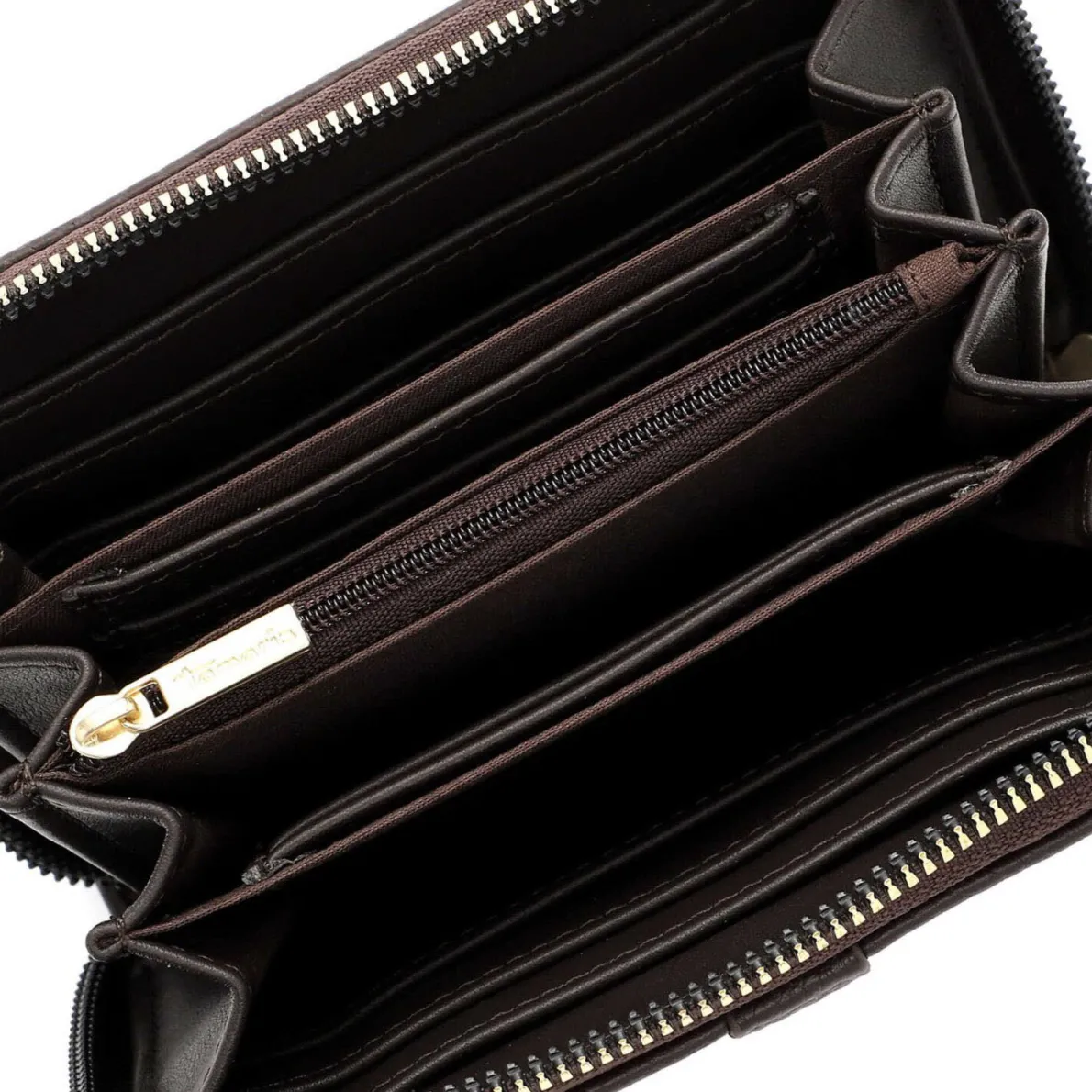Das Portemonnaie lässt sich durch einen umlaufenden Reißverschluss öffnen und schließen. Das Innenleben besteht aus großen Fächern für Geldscheine und zahlreichen kleinen Fächern für Karten und Ähnliches. Für Kleingeld verfügt die Geldbörse über ein separates Innenfach mit Reißverschluss.