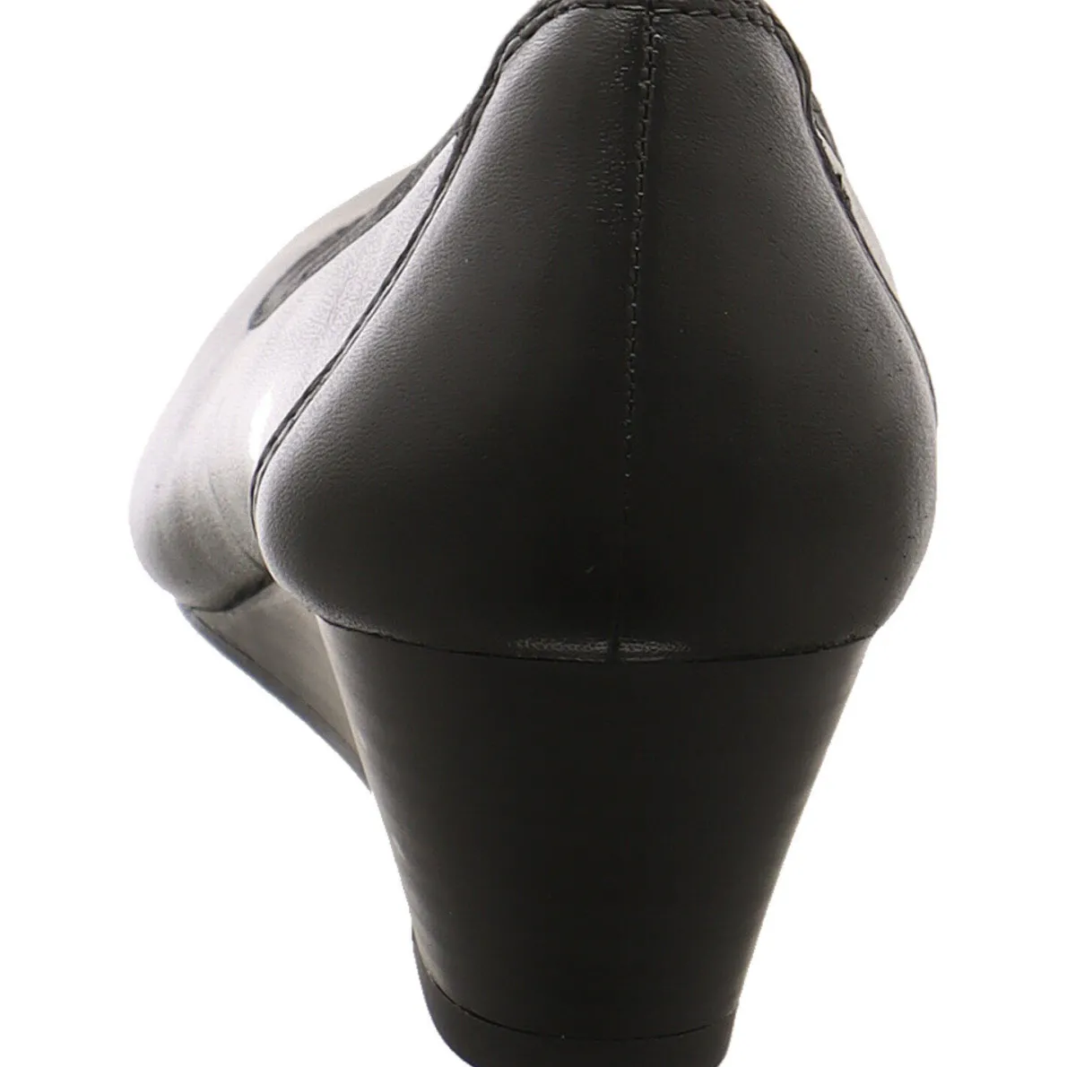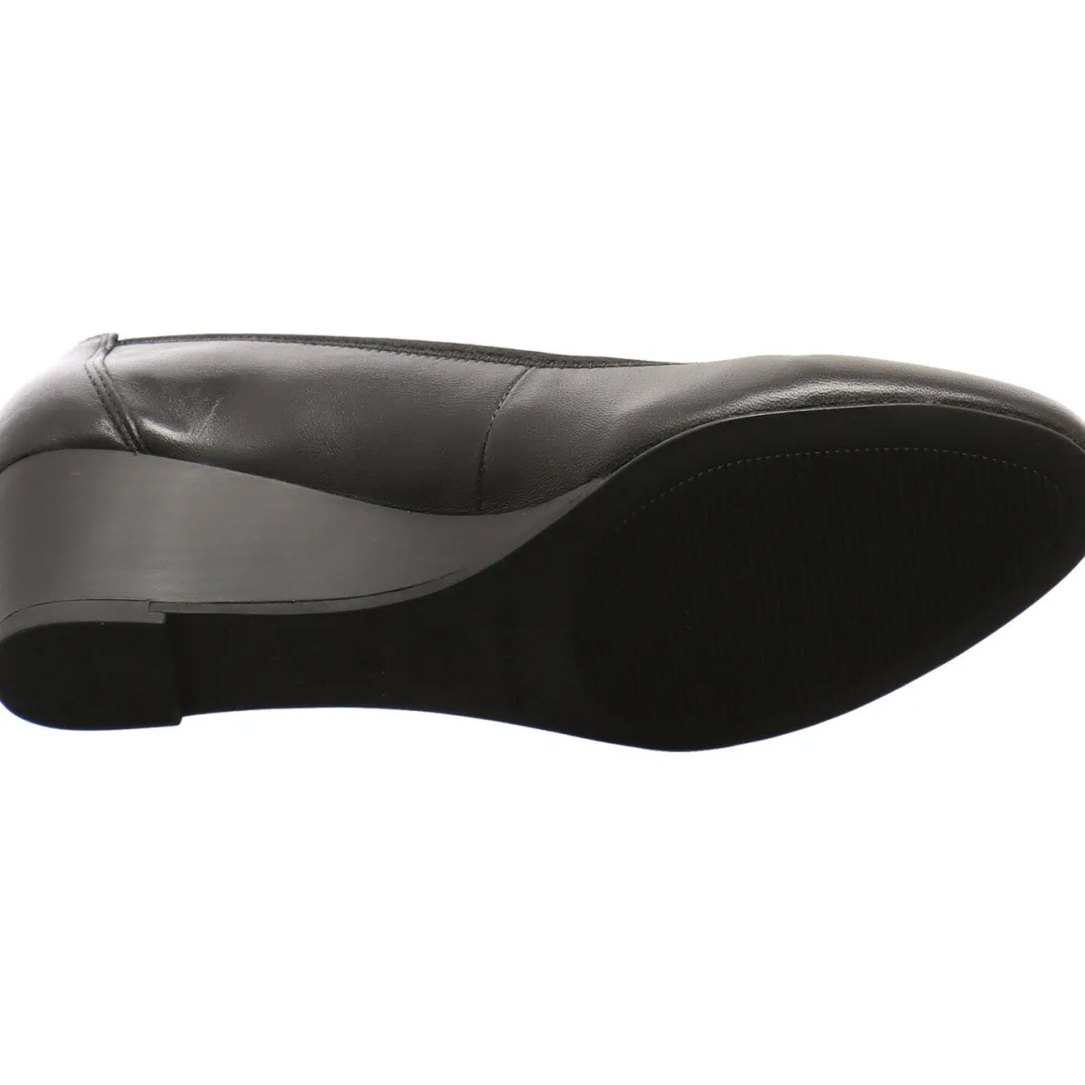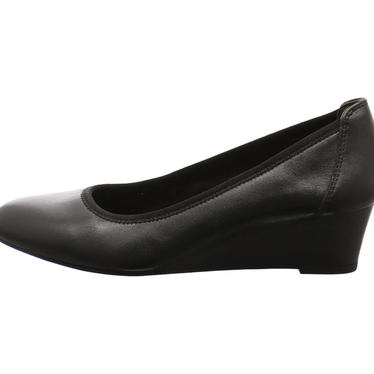 Die Borage sind puristische Keil Pumps von Tamaris in schwarz aus geschmeidigem Glattleder und mit leicht abgerundeter Schuhspitze.