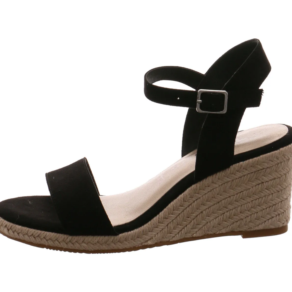 Diese Damen Sandalette von Tamaris in Schwarz ist ein vielseitiger und zugleich modischer Begleiter für die heißen Tage des Jahres. Das Obermaterial besteht aus Textil mit Veloursleder Haptik.