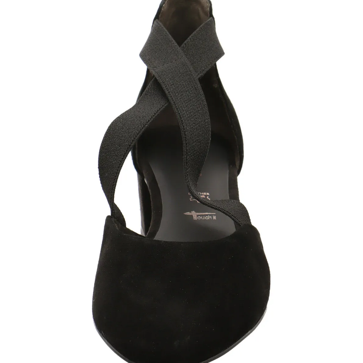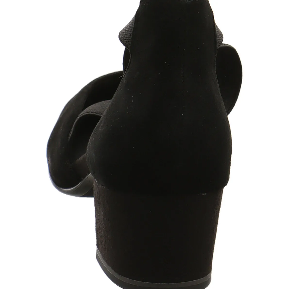 Er wurde aus hochwertigem Veloursleder in Schwarz gefertigt. Er lässt sich durch den dezenten Blockabsatz sehr angenehm tragen. Dieser ist mit der Anti Slide Funktion ausgestattet, so kommst du nicht ins rutschen. Das Touch It Echtleder Fußbett ist angenehm weich und zusätzlich komfortabel und mit den überkreuzten Riemen hast du zusätzlichen Halt. Diese sind aus Stretch, damit ist der Einstieg besonders einfach.