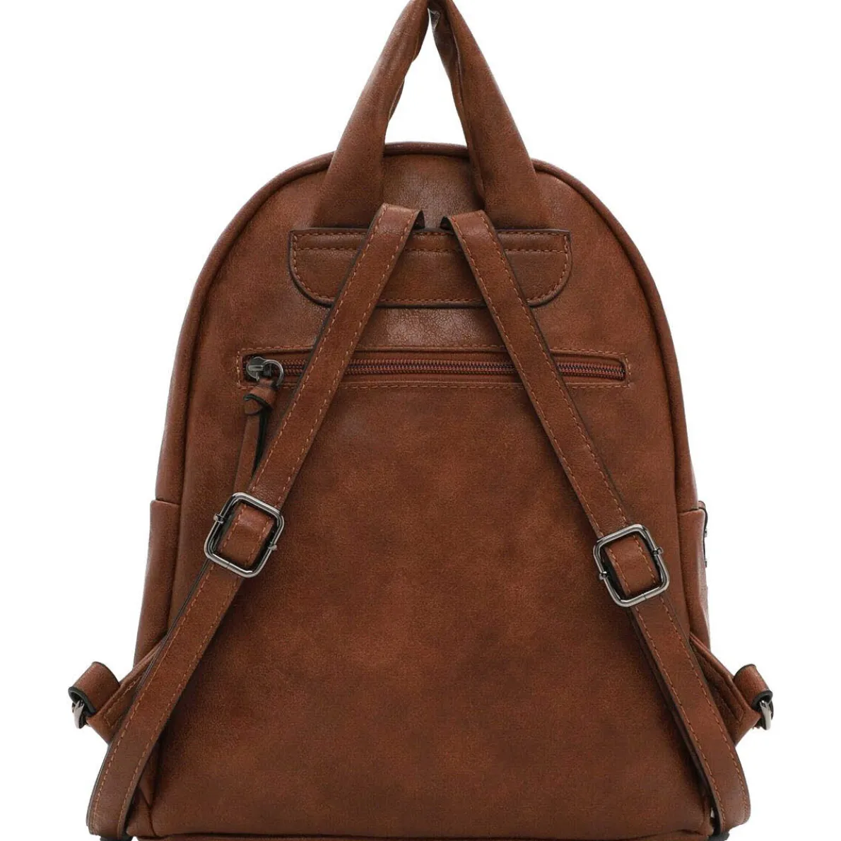 Das grob genarbte Obermaterial in Cognac Braun ist mit einem besonderen Finish versehen und verleiht dem Rucksack einen besonderen Look. Ein besonderer Hingucker sind die Anhänger mit den angebrachten Nieten.