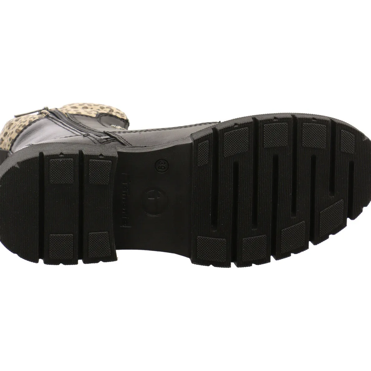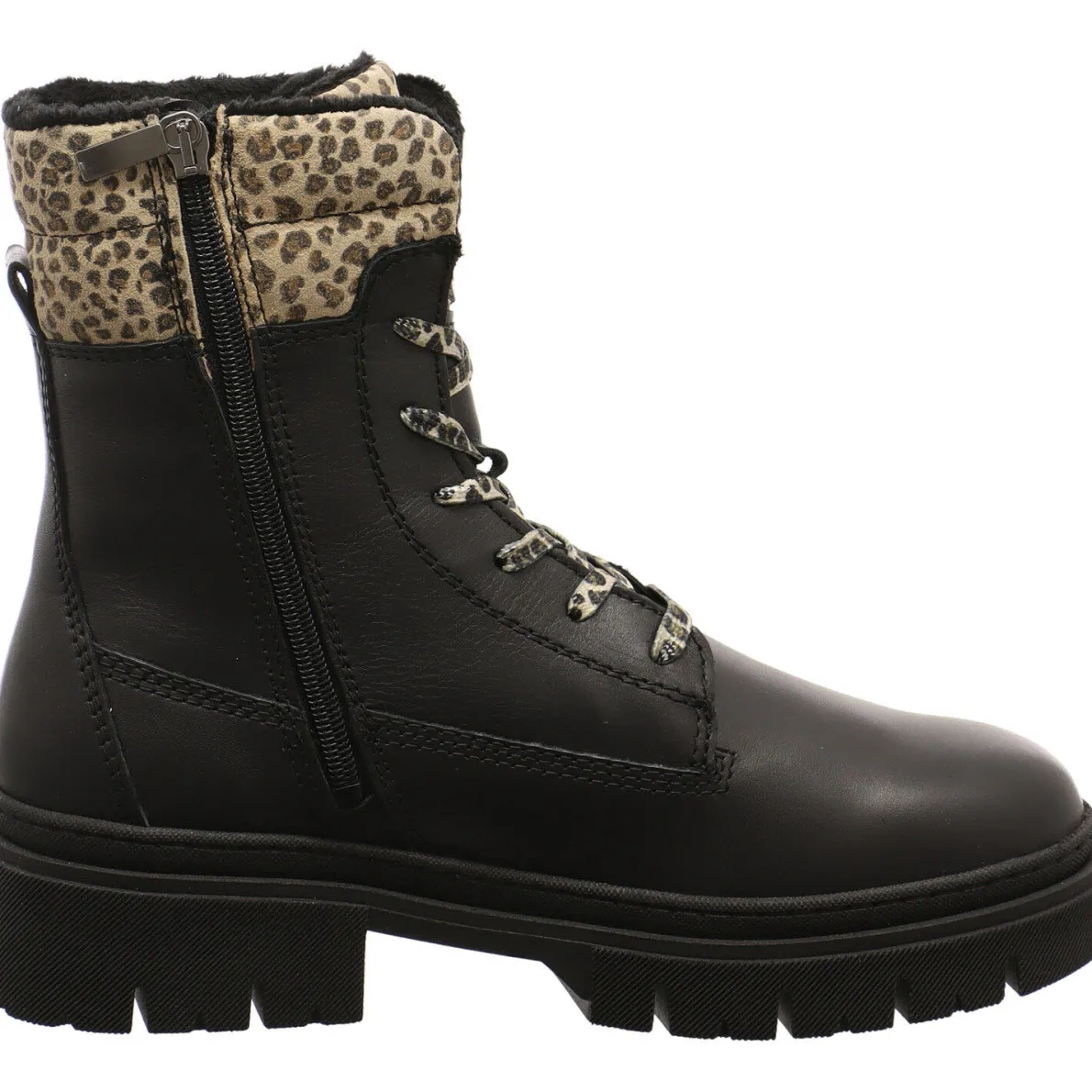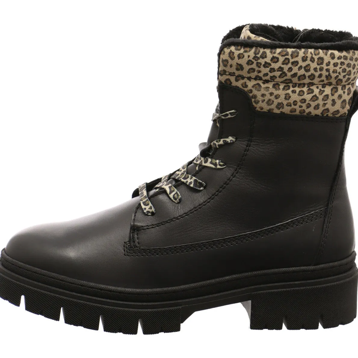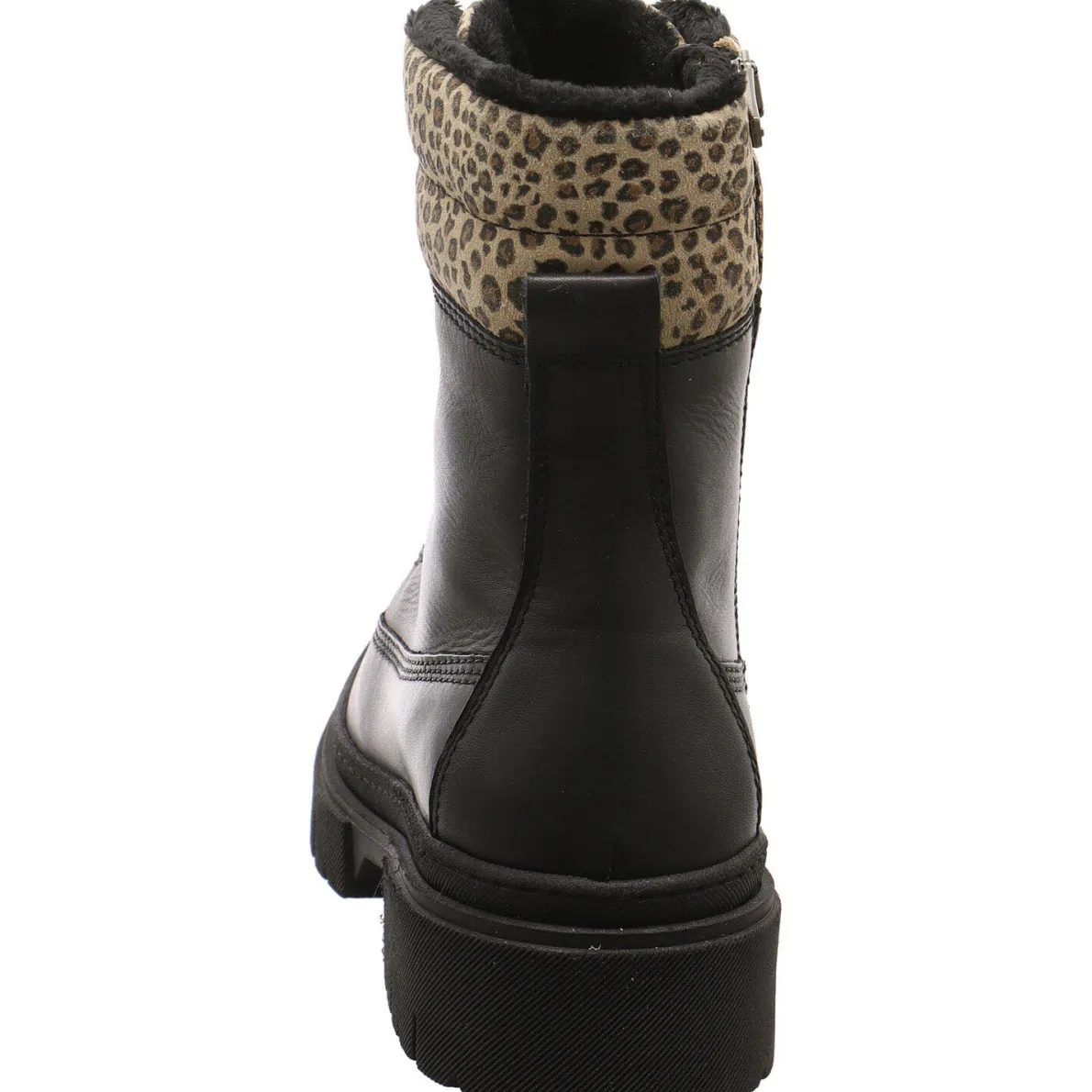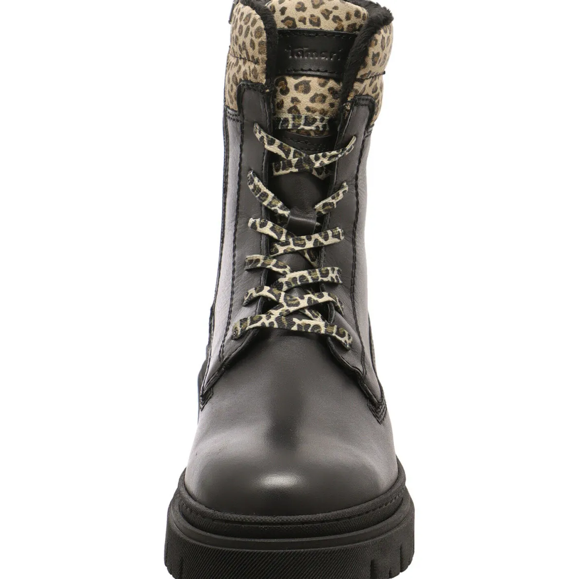 Das Obermaterial wurde aus hochwertigem Echtleder in Schwarz gefertigt. Der Schaft ist angenehm weich gepolstert und als Highlight mit einem Leo Animal Print versehen. Auch die Zunge und Schnürsenkel greifen das Leo Thema auf und machen den Boots zum absoluten Hingucker.