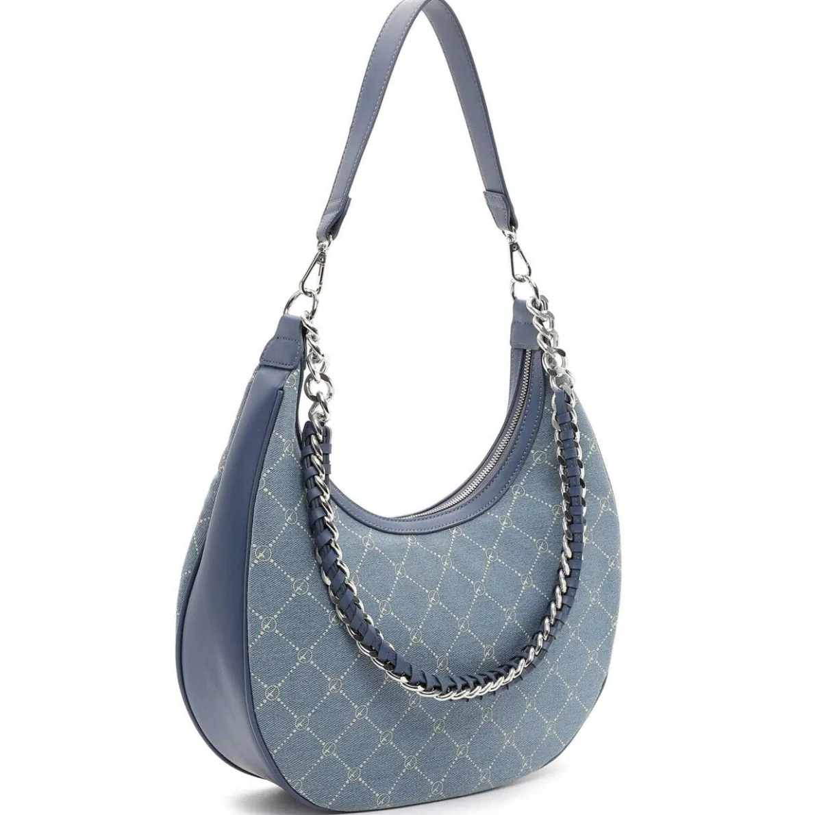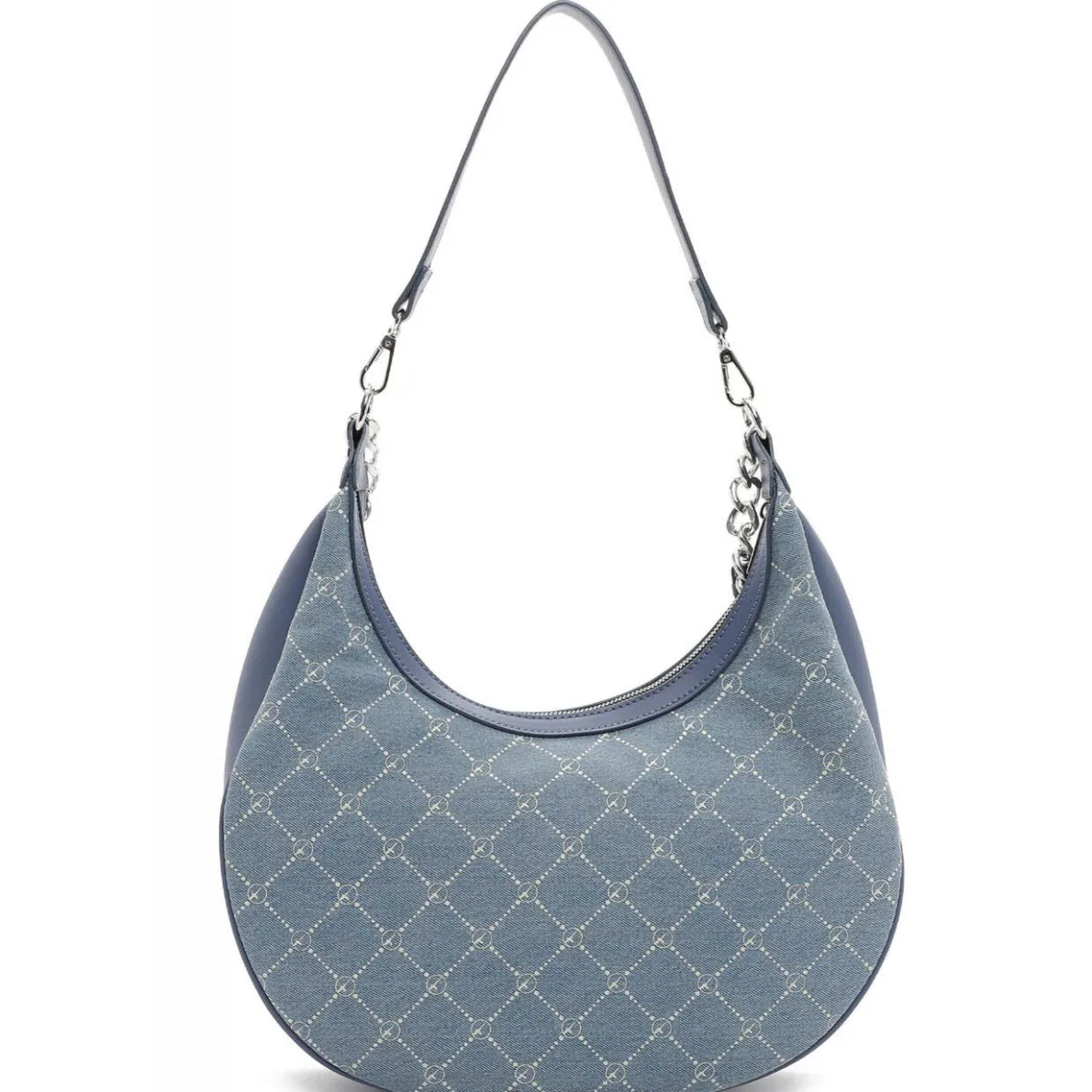 Die Anita ist eine Damen Schultertasche von Tamaris in Blau. Das Modell ist aus Kunstleder gefertigt und wurde mit einer angenehmen Haptik versehen, die an Jeans erinnert. Das Obermaterial wurde mit einem Logo-Print versehen, der der Handtasche einen edlen Look verleiht. Der zweite Trageriemen aus groben Kettengliedern ist ein besonderer Hingucker.