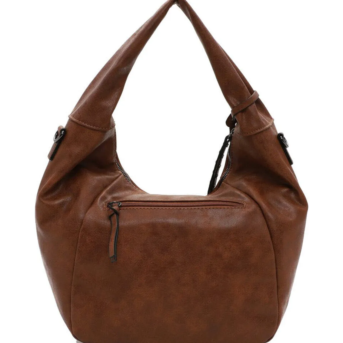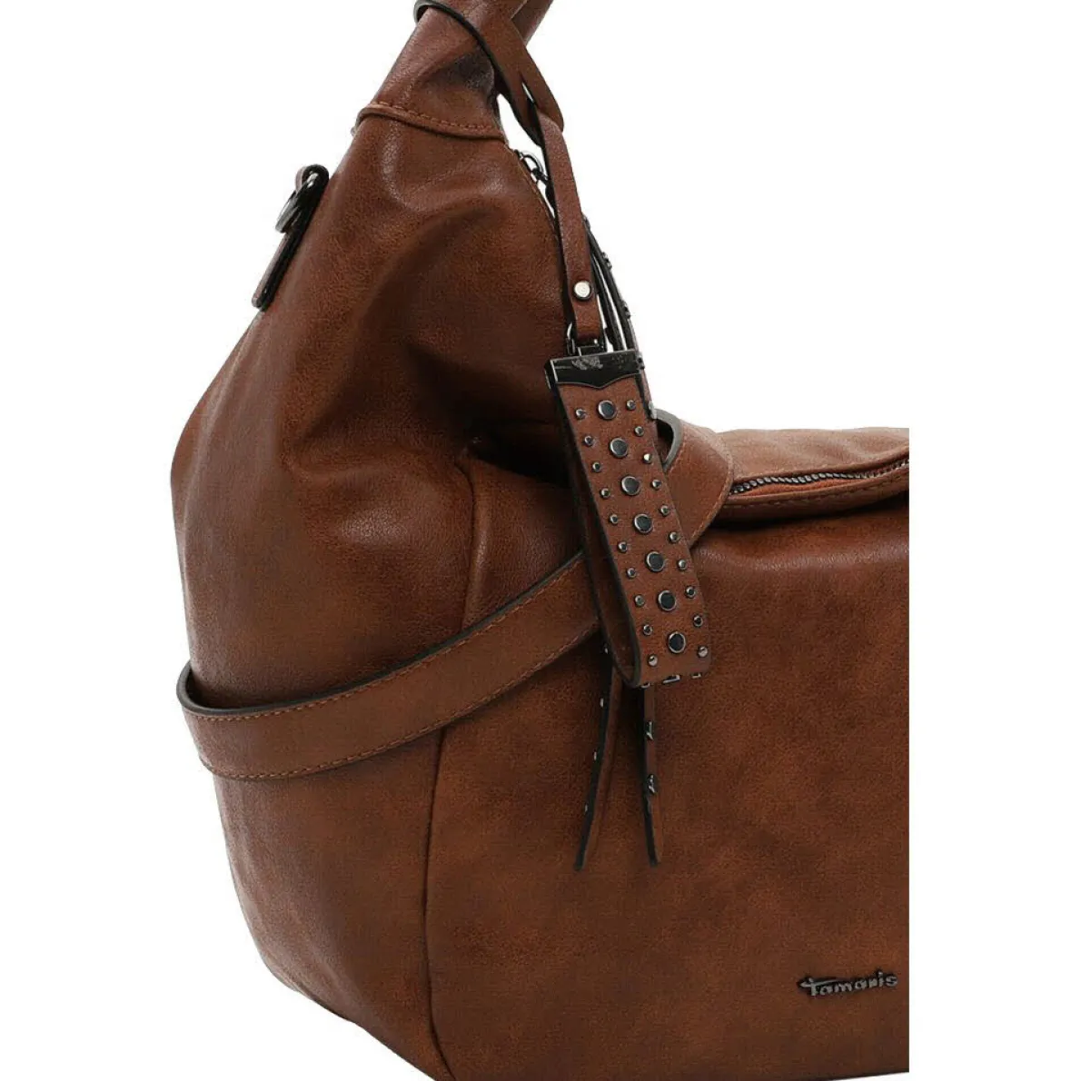 Die Schultertasche aus pflegeleichtem Kunstleder ist mit einer angenehmen Haptik versehen, die der Handtasche das gewisse Etwas verleiht. Ein besonderer Hingucker ist der hübsche Anhänger mit den angebrachten Nieten. Der mitgelieferte Umhängegurt ermöglicht ein crossover Tragen der Handtasche.