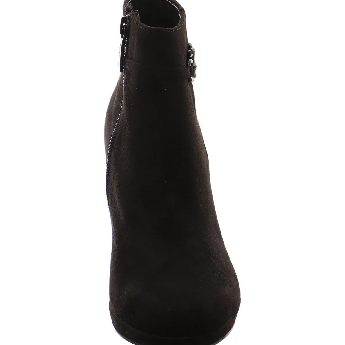 Die Ankle Boots wurden aus Textil in Schwarz mit feiner Nubukhaptik gefertigt und fallen besonders durch den 8,5 cm hohen Trichterabsatz ins Auge. Ein weiteres tolles Detail ist die seitliche Metall Applikation in Schwarz.