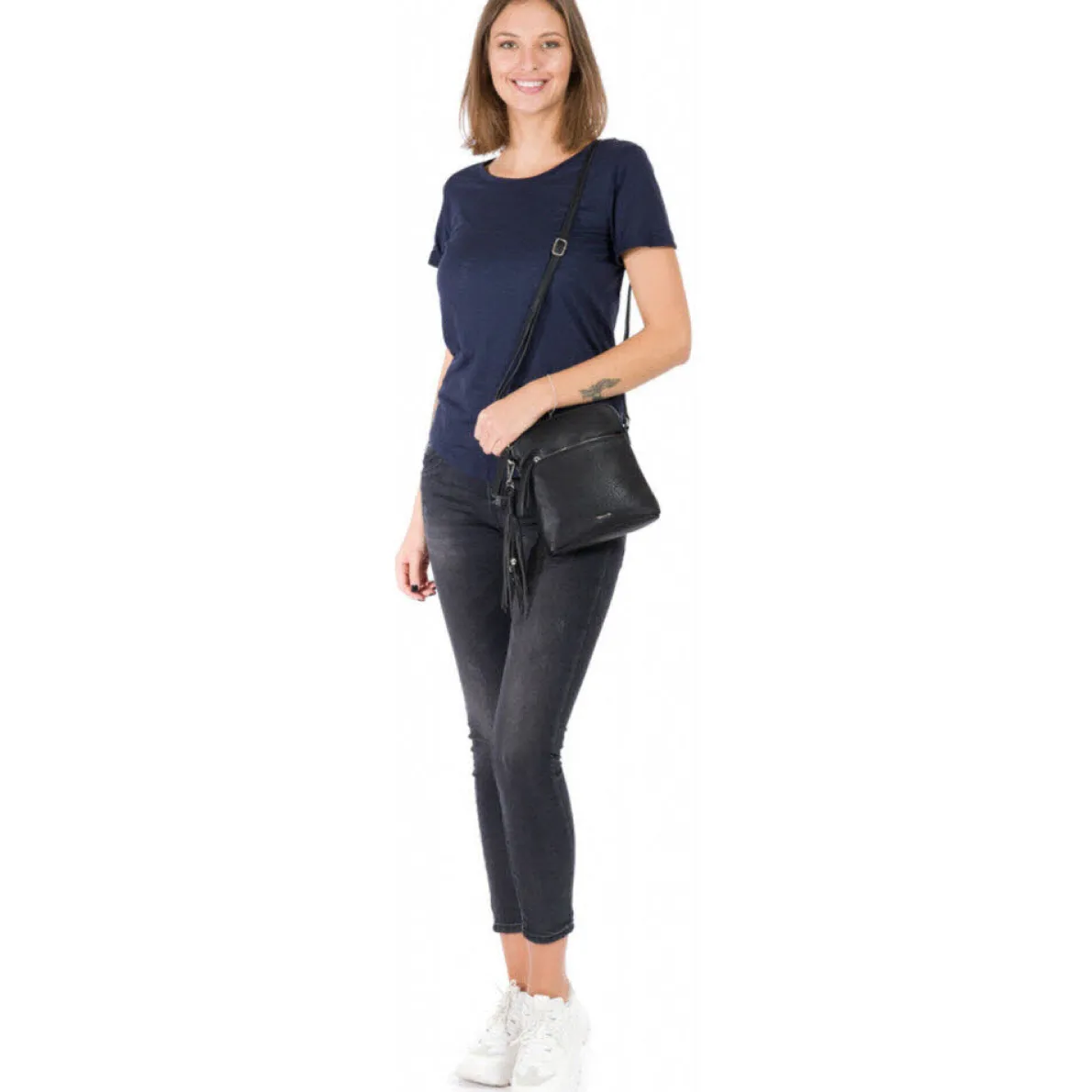 Die Adele ist eine kleine Damen Umhängetasche von Tamaris aus hochwertigem Kunstleder in Schwarz. Das Hauptfach kann durch einen Reißverschluss geöffnet und geschlossen werden. Die Handtasche bietet Platz für alle Kleinigkeiten, auf die Sie im Alltag nicht verzichten möchten. Der Umhängegurt ist individuell einstellbar und dadurch kann die Tasche auch crossover getragen werden.