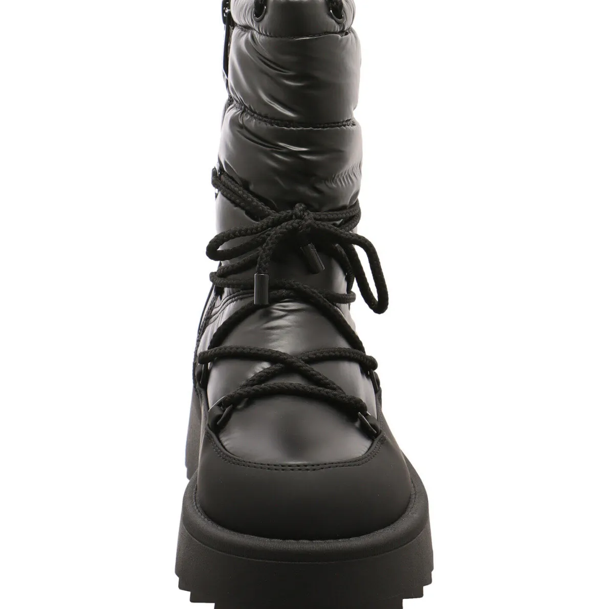 Sofort ins Auge fällt hier die besondere Aufmachung des Obermaterials in Schwarz aus einem Mix aus Synthetik und Textil. So sind der Schaft und der obere Fußbereich, wie bei einer Winterjacke gesteppt und gefüttert. Durch den seitlichen Reißverschluss kommst du leicht in den Schuh und mit dem Tunnelzug am Schaft und der Schnürung kannst du die Passform optimieren. Er ist mit DuoTex ausgestattet, diese macht den Boots wasserabweisend und atmungsaktiv. Das dicke Innenfutter hilft zusätzlich, die Füße angenehm warm zu halten.
