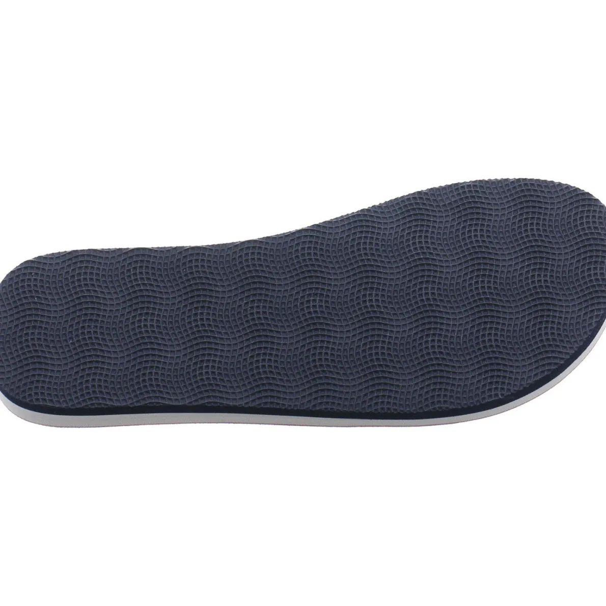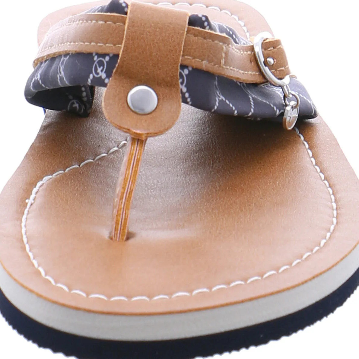 Das Obermaterial in Braun in einem originellen Mix aus einem schmalen Kunstlederbändchen und einem breiten Satinband in Navy Blau mit grafischem Muster macht diese Zehentrenner einzigartig und zugleich absolut bequem.