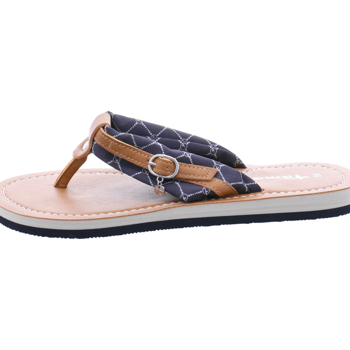 Diese individuell gestaltete Damen Zehentrenner Pantolette aus Kunstleder und Textil von Tamaris ist ein Must Have für den kommenden Sommer.