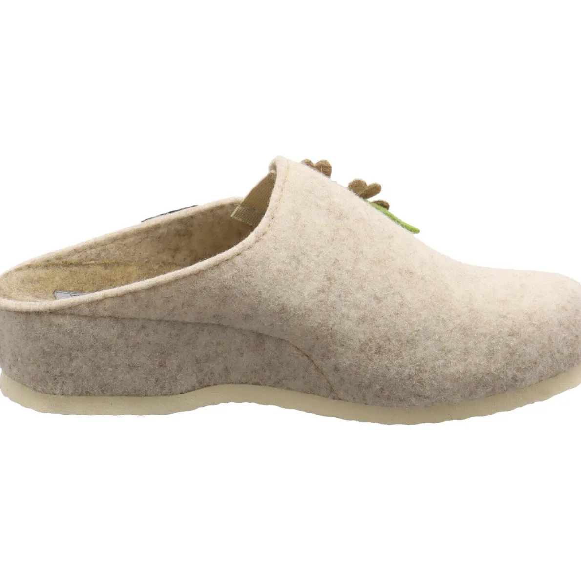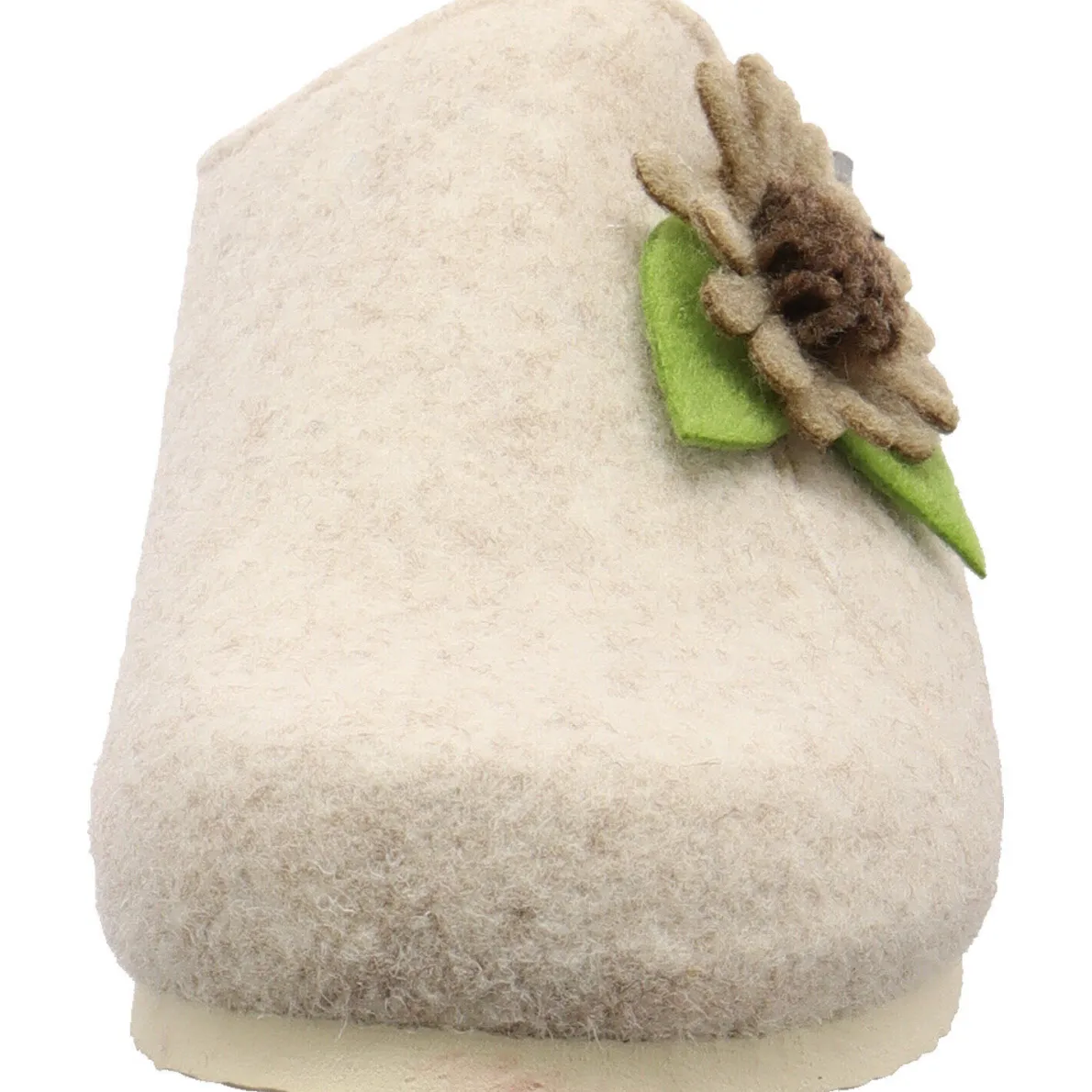 Als Eyecatcher auf dem robusten und langlebigen Obermaterial aus ökologischem Naturwollfilz in hellem Grau dient die aufgesetzte Filz Blume, die dem Schuh das gewisse Etwas verleiht.