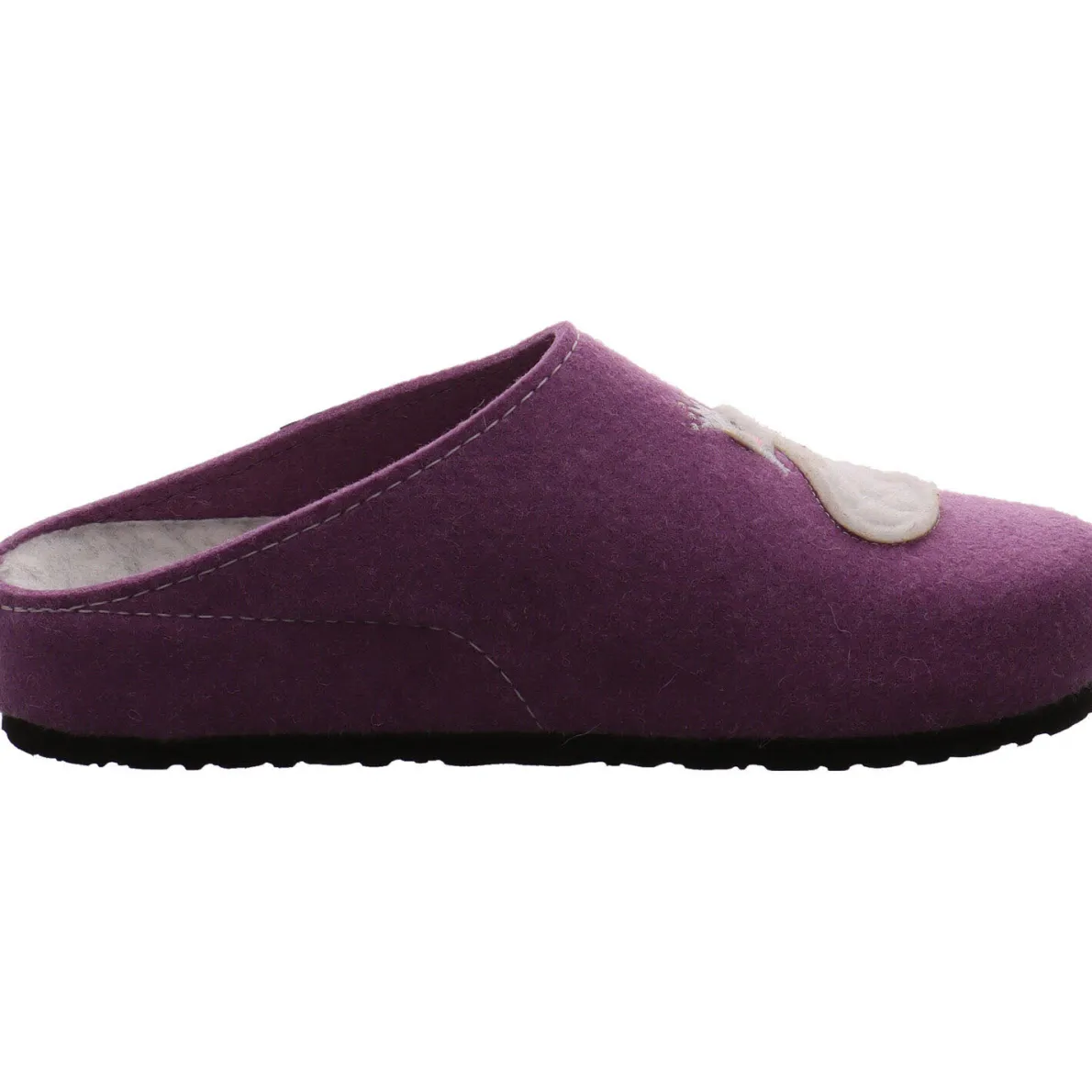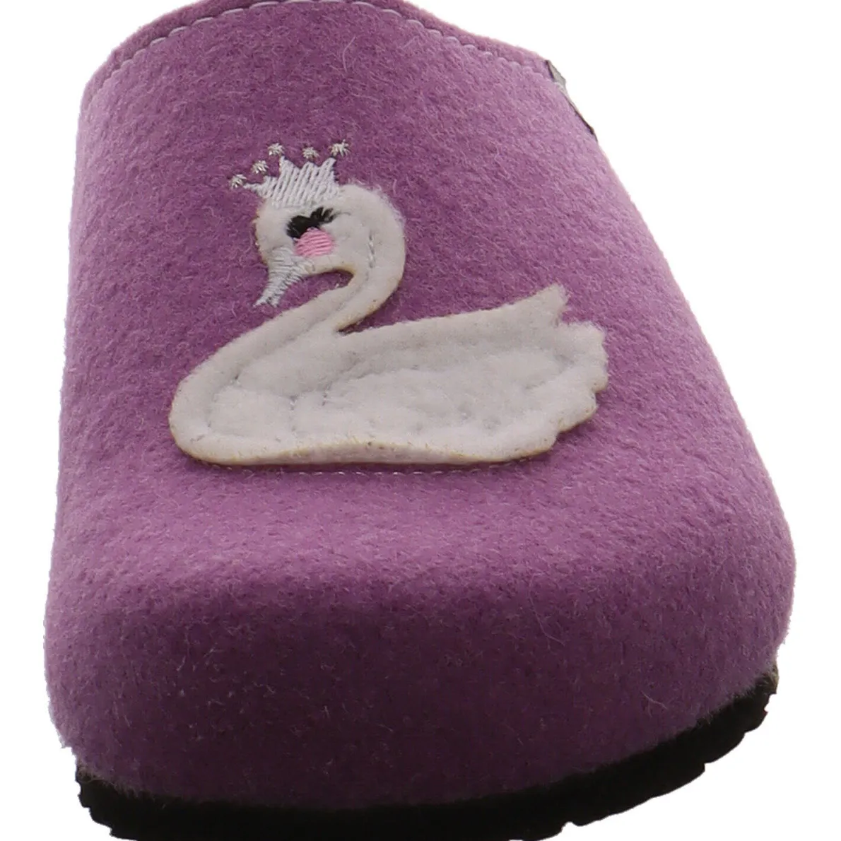 Gefertigt wurde der Schuh aus langlebigem echtem Naturwollfilz in Lila. Ein besonderes Highlight ist der niedliche Schwan mit Krone auf der Vorderseite des Schuhs.
