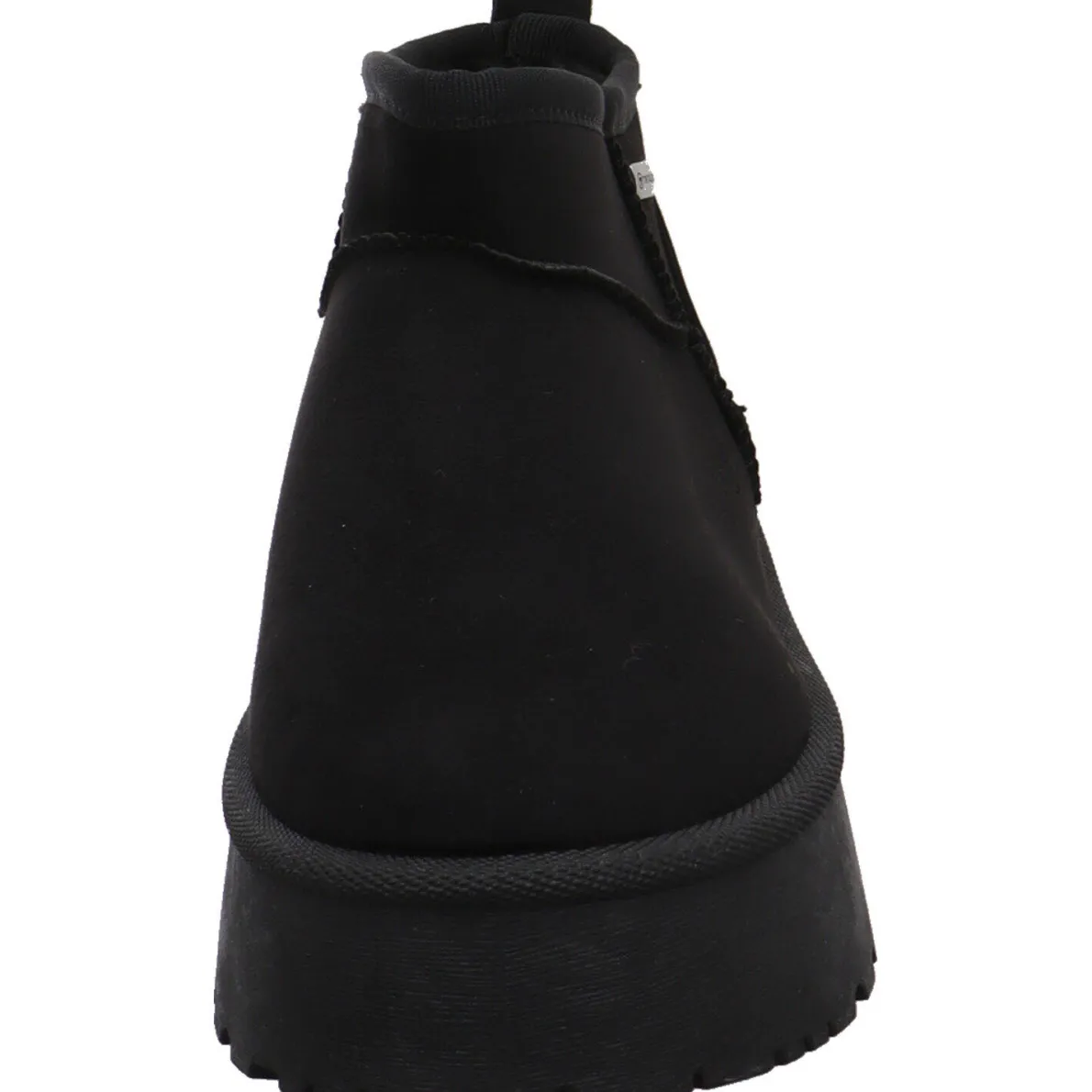 Er wurde aus Textil ist Schwarz gearbeitet und begeistert durch seine lässige Form. Der Schaft hat eine tolle Lienenführung und kommt mit einem Rock oder schmalen Hose besonders gut zur Geltung. Das Innenfutter ist aus Plüsch und besonders weich und flauschig. Durch den weiten Schaft und der Textillasche ist der Einstieg ganz einfach.