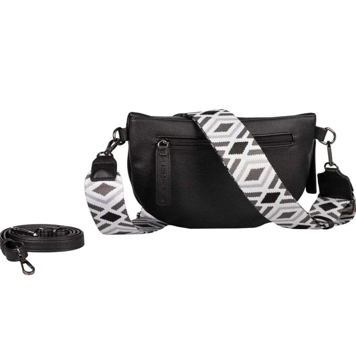 Gefertigt aus authentisch genarbtem Kunstleder in Schwarz macht sie zu jedem Outfit eine ausgesprochen gute Figur. Durch ihr kompaktes Format kann die Tasche auch prima nur für die notwendigsten Dinge genutzt werden. Absolutes Highlight und besonders modern ist der Umhängegurt mit dem grafischem Muster in Schwarz Weiß.