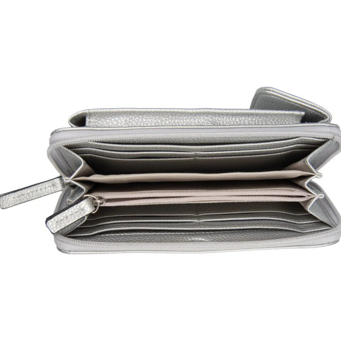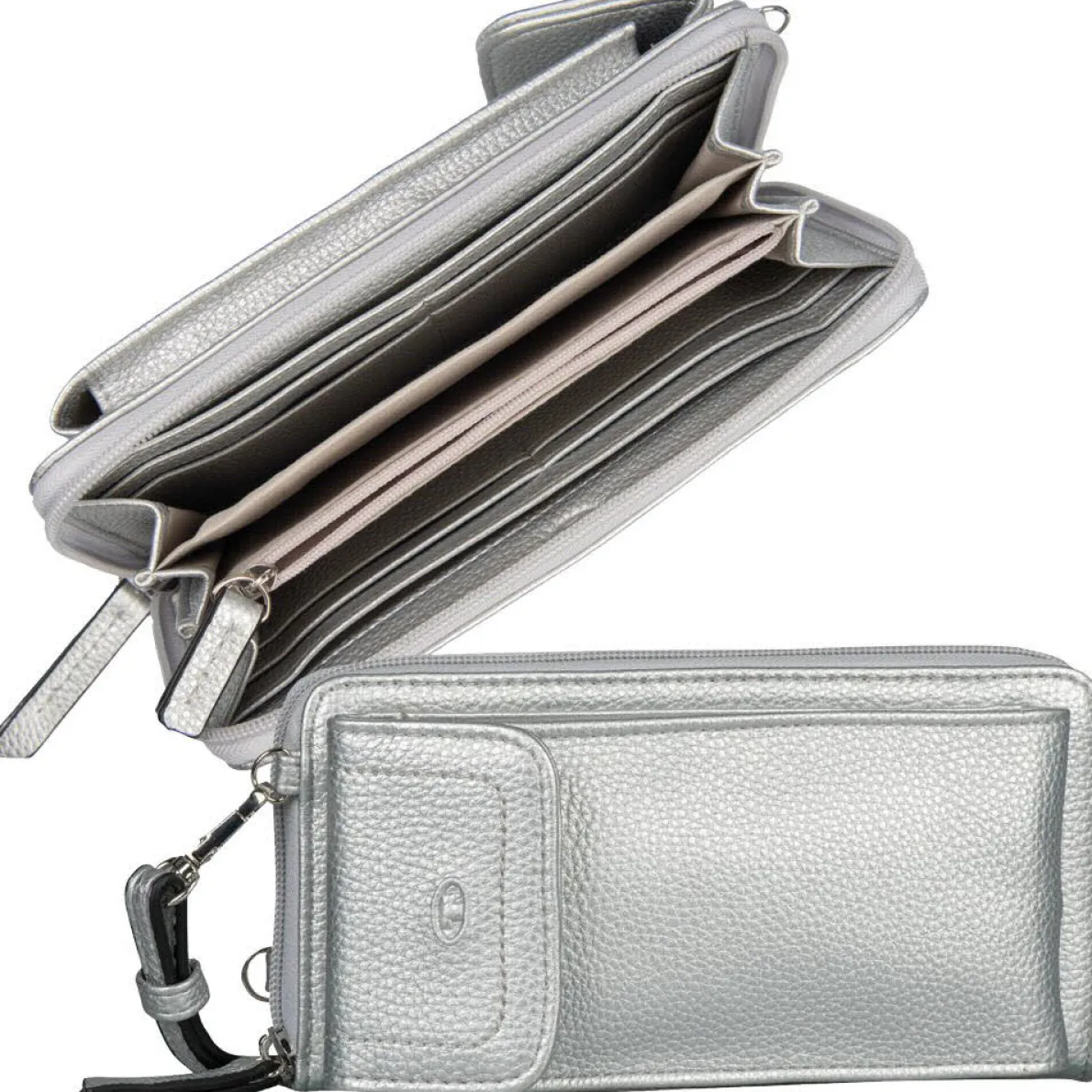 Ein geräumiges Außenfach bietet Platz für dein Handy. Das Hauptfach wird mit Reißverschluss geschlossen. Das Innenleben besteht aus großen Fächern für Geldscheine und zahlreichen kleinen Fächern für Karten und Ähnliches. Für Kleingeld verfügt die Langbörse über ein separates Fach mit Reißverschluss. Durch den praktischen Umhängegurt kann die Geldbörse auch sicher am Körper crossover getragen werden.