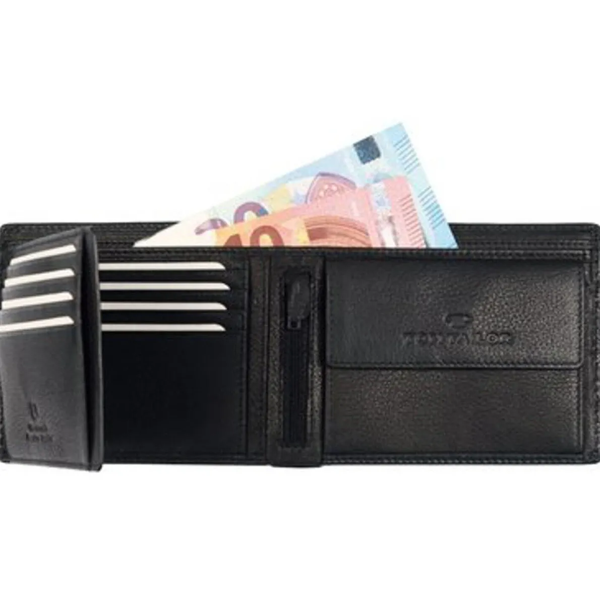 Diese Herren Geldbörse Kai Wallet von Tom Tailor ist aus weichem Echtleder in Schwarz gefertigt. Mit vielen praktischen Fächern für Karten und Geldscheine hält sie alles Wichtige stets griffbereit. Für Kleingeld hat sie ein separates Fach mit Druckknopf. Die Steppnähte Ton in Ton zum Obermaterial geben der Geldbörse einen leicht rustikalen Look und das dezent eingeprägte Markenlogo macht dieses Portemonnaie zu einem echten Eye-Catcher, der zudem überaus praktisch ist.