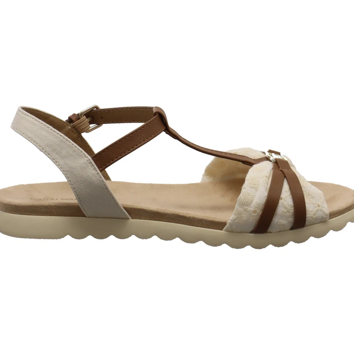 Die Riemen aus Kunstleder in Braun geben guten Halt und der vordere Riemen ist mit Textil in Creme Weiß weich unterlegt.