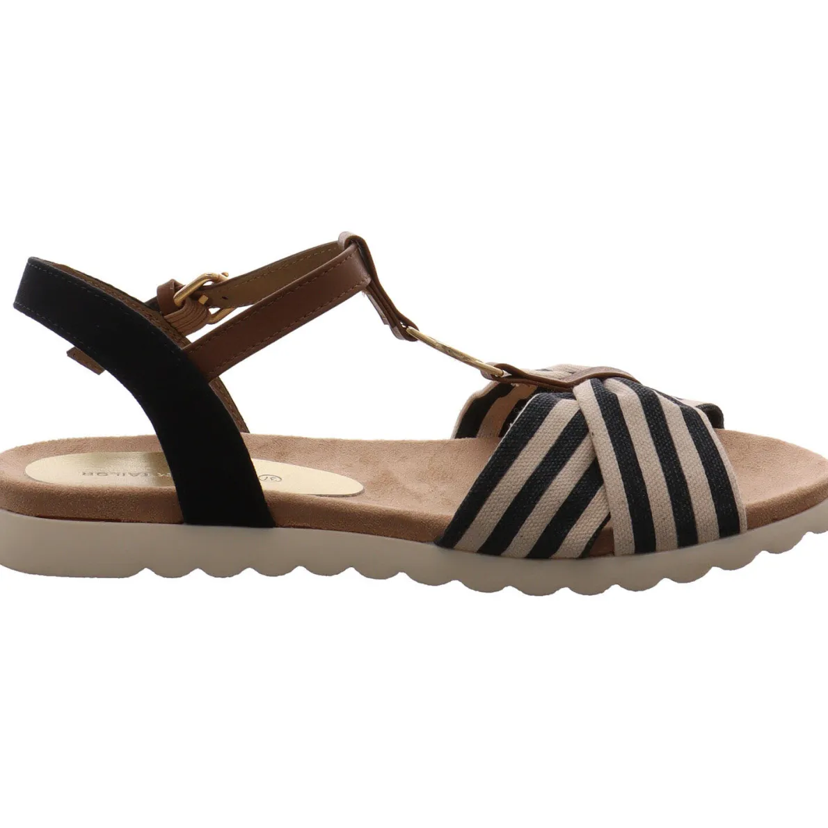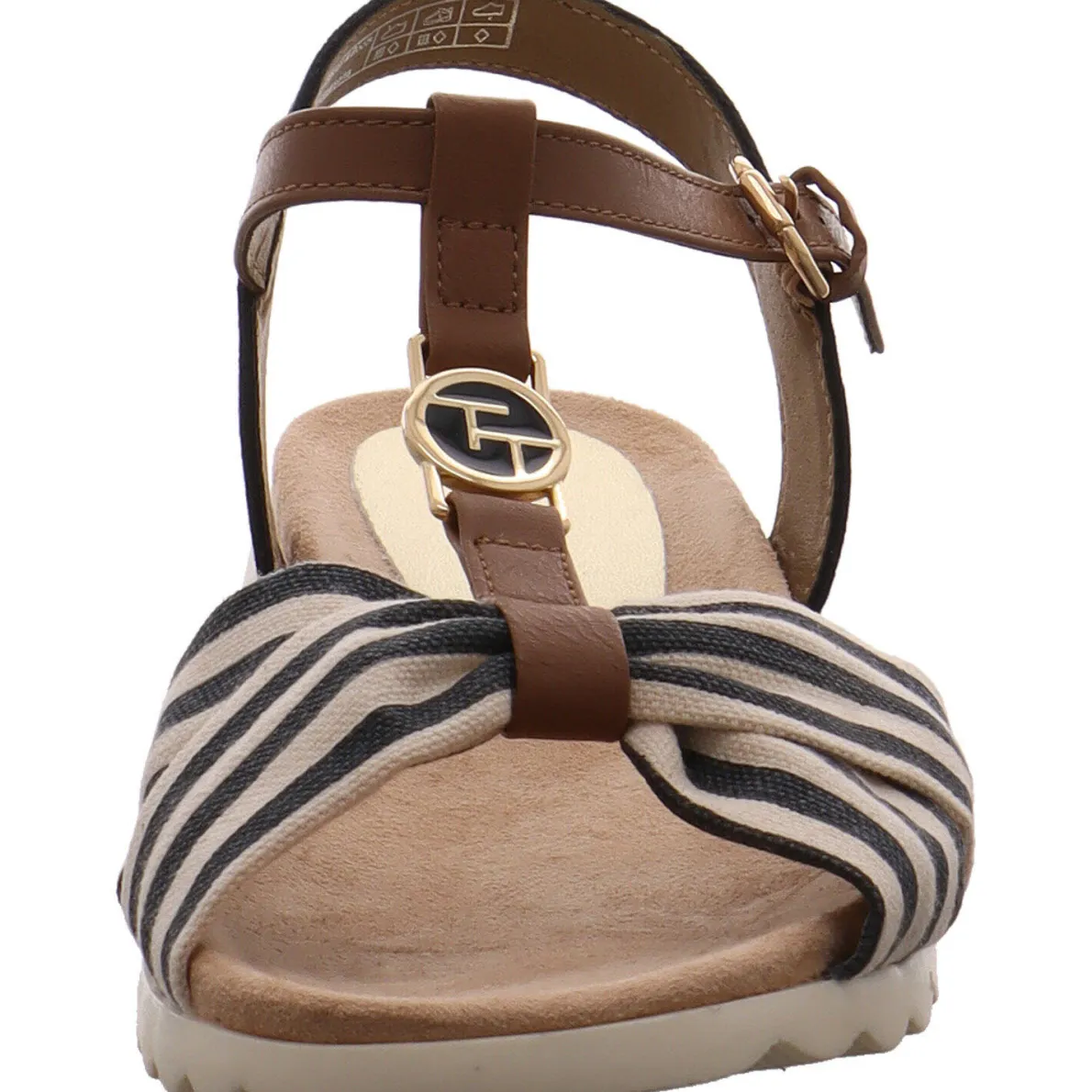 Mit dieser schönen Damen Sandale von Tom Tailor bist du perfekt ausgestattet. Der Materialmix aus Textil und Kunstleder ist in einem maritimen Design mit Streifen in Blau und Weiß gehalten. Abgerundet wird es durch Farbakzente in Cognac Braun auf dem Blatt und dem Riemen am Knöchel. Ein Eyecatcher ist dabei die Metall Applikation des Markenlogos auf dem T-Strap. Der Riemen lässt sich durch die verstellbare Schnalle optimal anpassen und gibt einen guten Halt. Die weiche Innensohle bietet einen angenehmen Tragekomfort.
