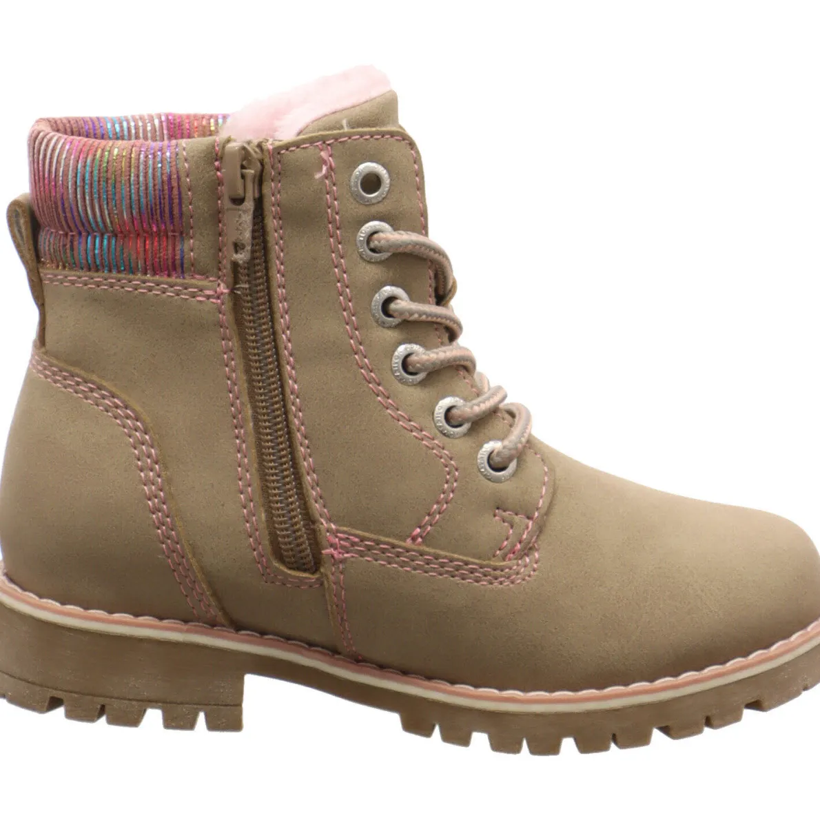 Gefertigt aus Kunstleder in Beige und mit farblich abgesetzten textilen Schaftabschluss in bunten Glitzer Streifen passt dieser Schuh perfekt zu jedem Herbstoutfit. Die Ziernähte in Rosa runden das Design des Schuhs gekonnt ab.