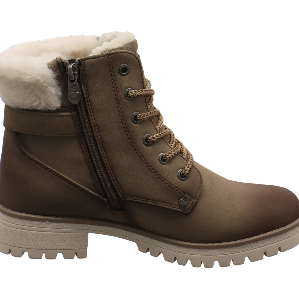 Ein besonderer Hingucker sind die Ziernähte und farblich abgesetzten Schnürsenkel sowie der Schaftrand mit weichem Fellimitat. Eine kleine Schnalle am Schaft wertet den Winterstiefel optisch auf.