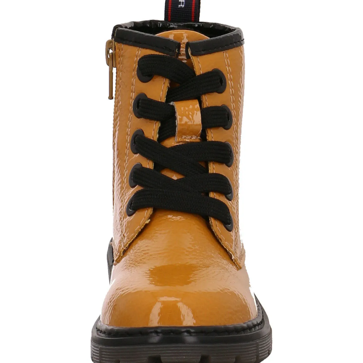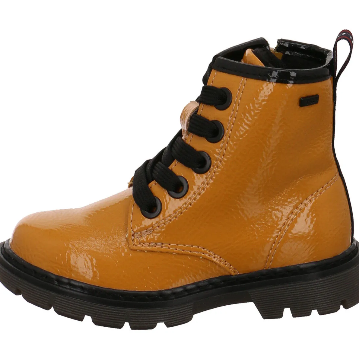 Gefertigt aus Kunstleder in Gelb Lack Optik begeistert er jedes Mädchen durch sein modisches Aussehen. Highlights sind die Schnürsenkel in Schwarz und das Textilband als Einstieghilfe in Blau mit Marken Logo an der Rückseite vom Schaft.