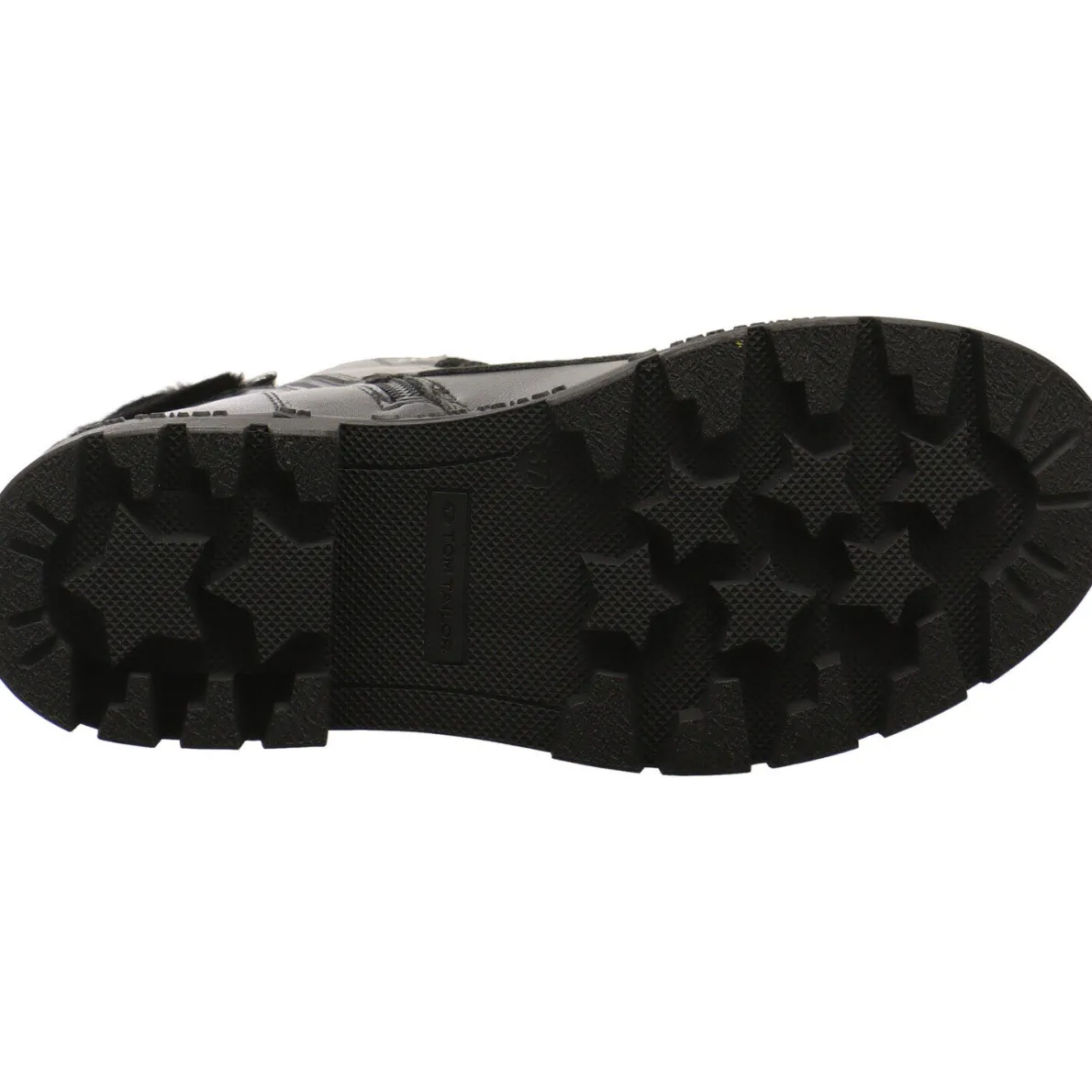 Das Obermaterial aus Kunstleder in Schwarz, hat einen cleanen Look. Dennoch sind Eyecatcher eingearbeitet. So findest du neben der Schnürung einen Zierzipper und der weiche Schaft ist mit einer Plüschkante versehen. Diese gibt ihm einen winterlichen Touch und macht ihn besonders angenehm zu tragen. Auch das Innenfutter ist angeraut und hält deine Füße warm.