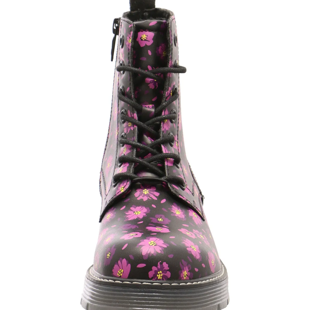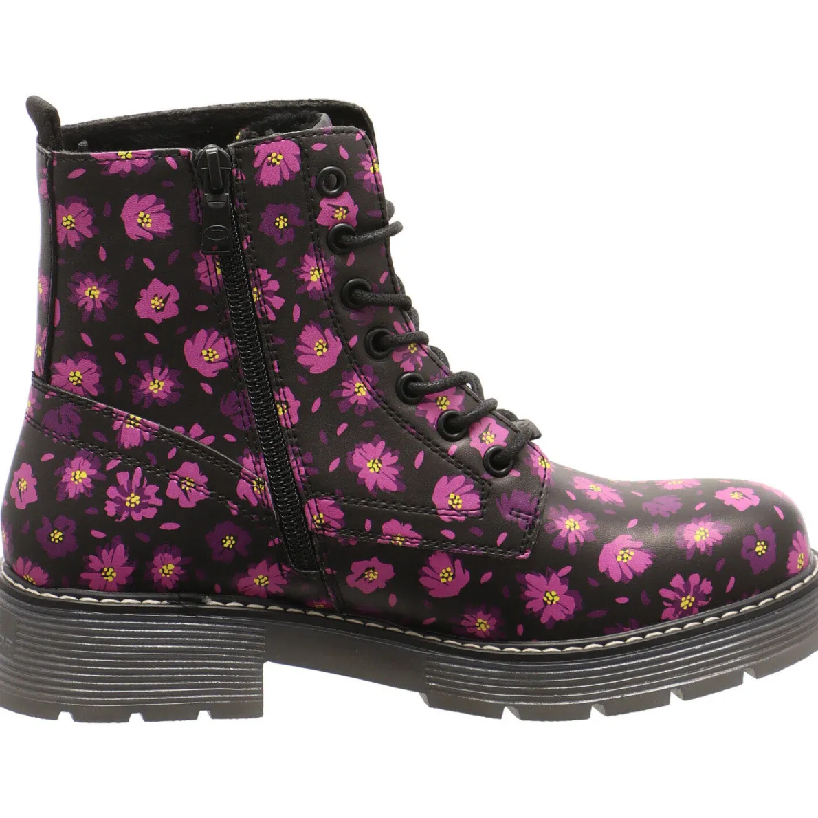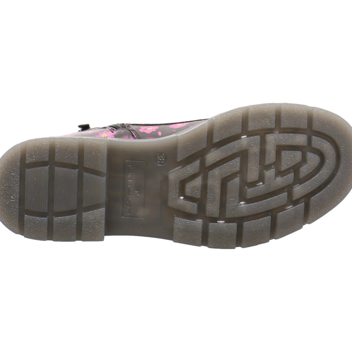 Ein absoluter Eyecatcher ist dabei das Obermaterial aus Kunstleder in Schwarz, welches mit einem Allover Blumen Print in Pink verziert ist. Damit kommt auch an trüben Herbst Tagen automatische Gute Laune auf.
