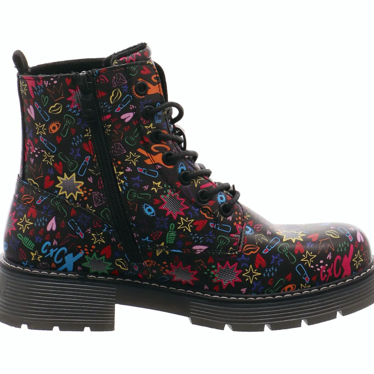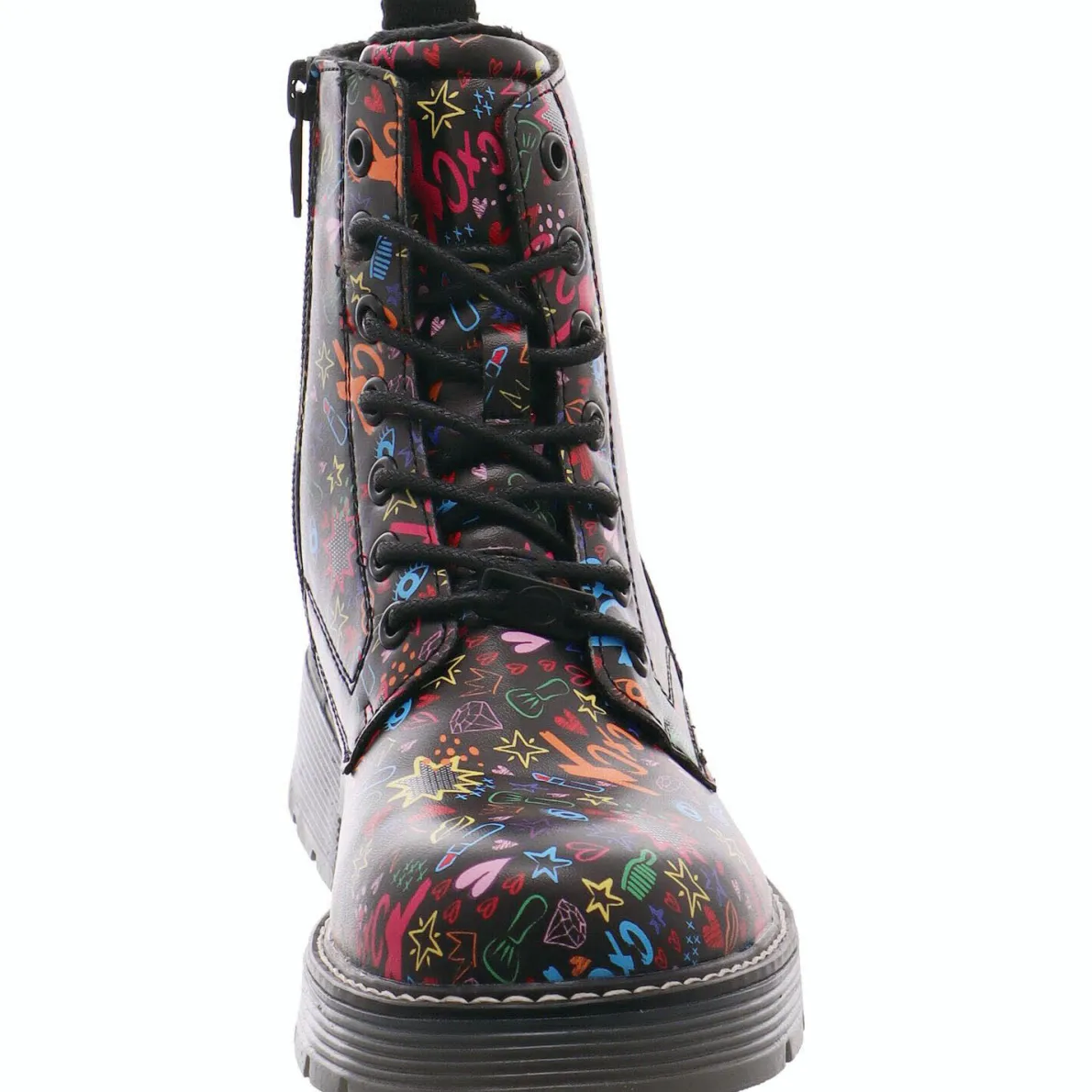 Dieser Damen Schnürboots von Tom Tailor ist ein absoluter Eyecatcher. Das Obermaterial aus Kunstleder in Schwarz wurde mit einem Print mit verschiedenen Motiven gefertigt..