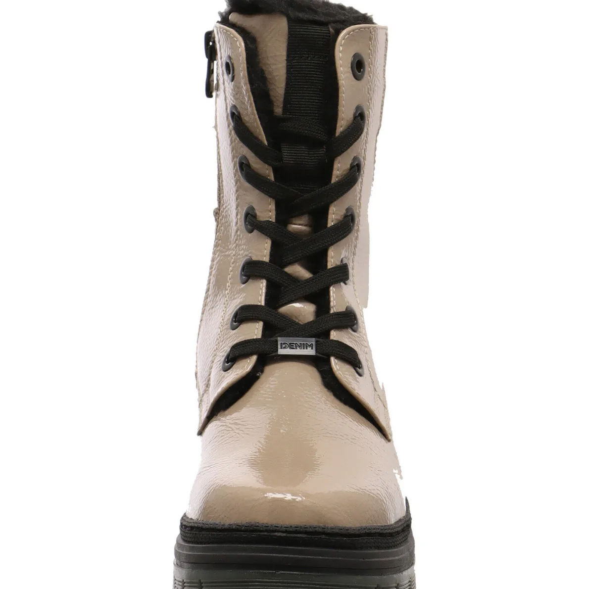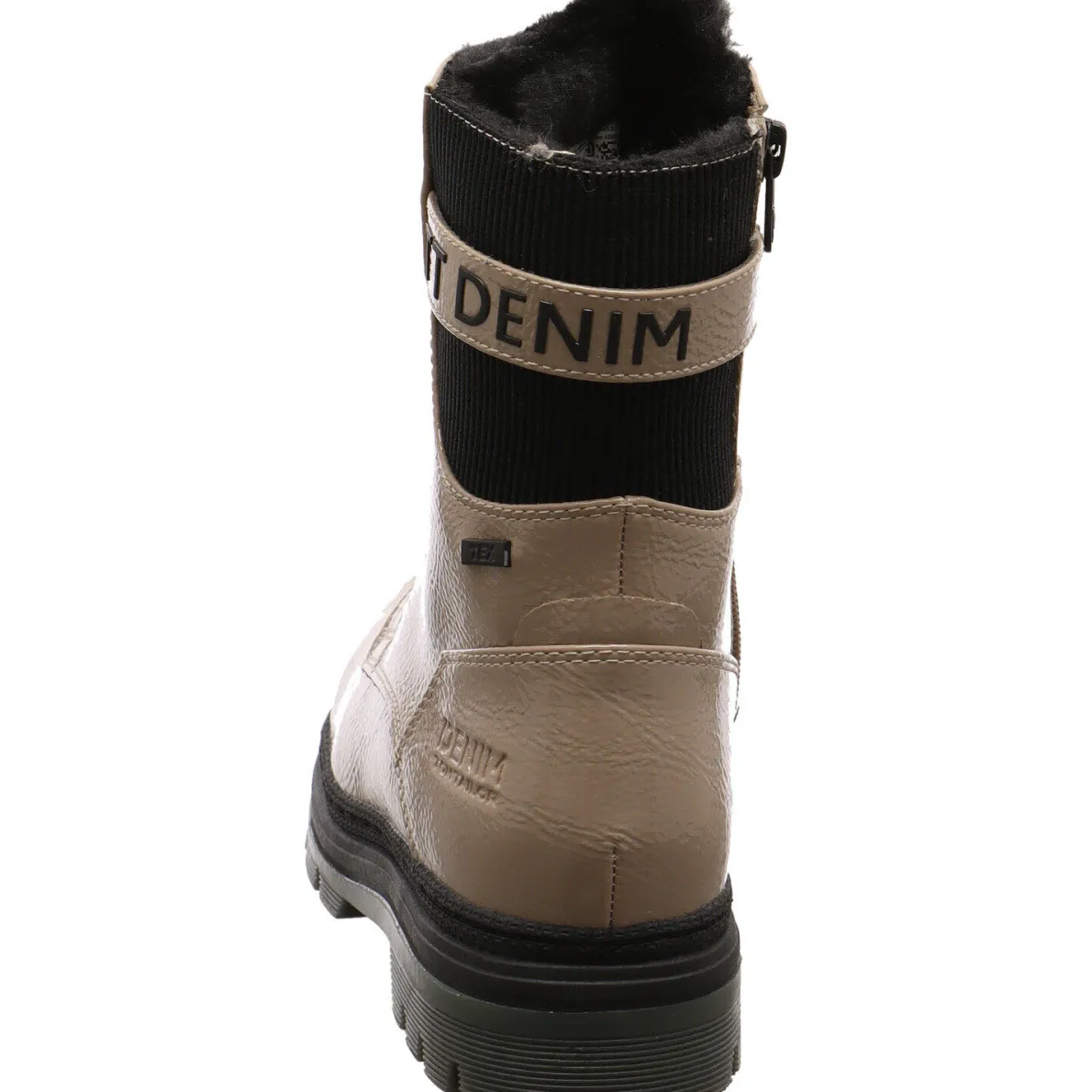 Das Obermaterial aus Kunstleder, begeistert durch seine Lack Optik in Beige und dem Strick Einsatz im Schaft in Schwarz.