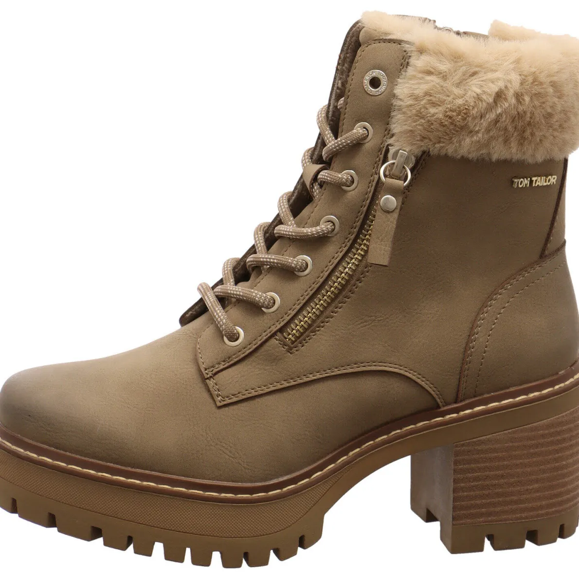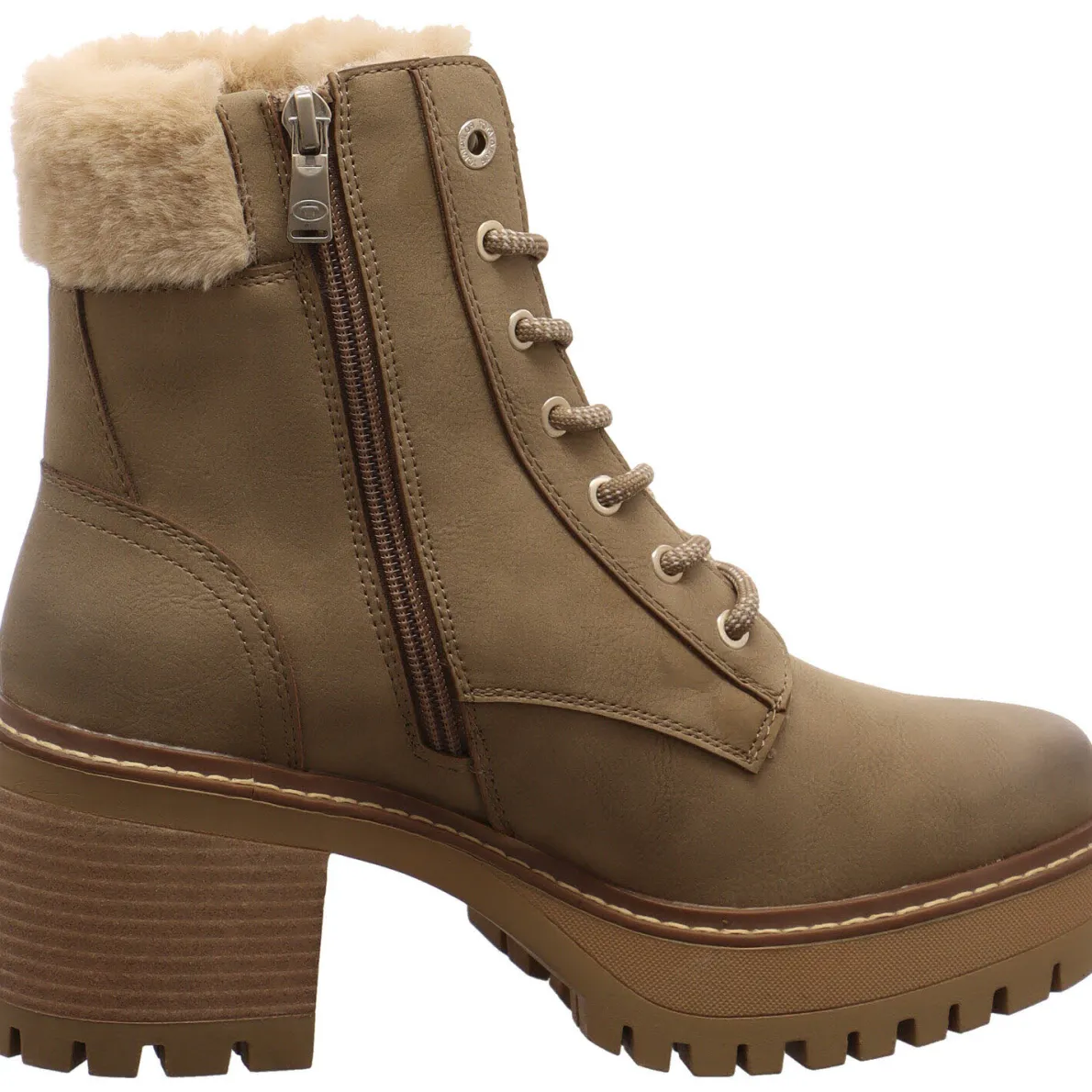 Diese Damen Schnürstiefelette von Tom Tailor ist ein absoluter Eyecatcher. Das Obermaterial aus authentisch genarbtem Kunstleder in Braun wird durch den Plüsch Schaftrand aus Textil gekonnt in Szene gesetzt.
