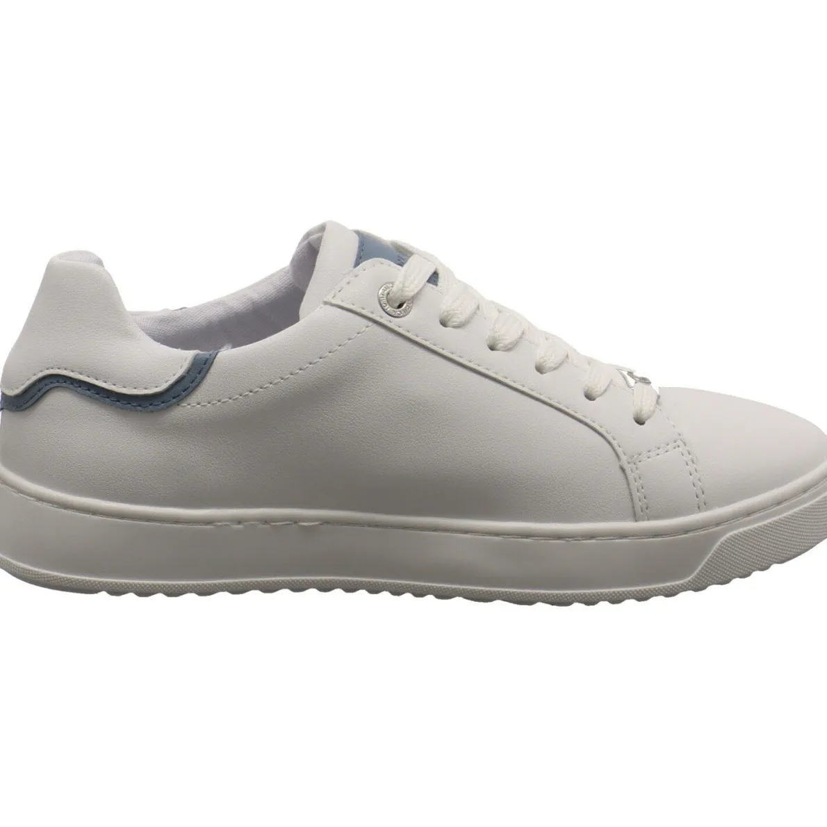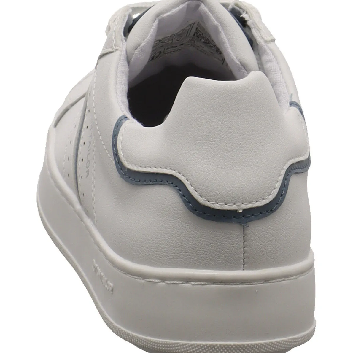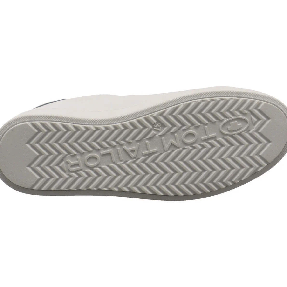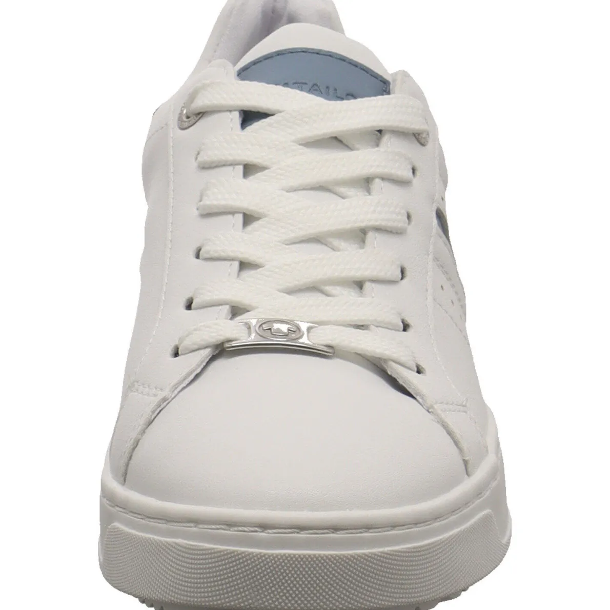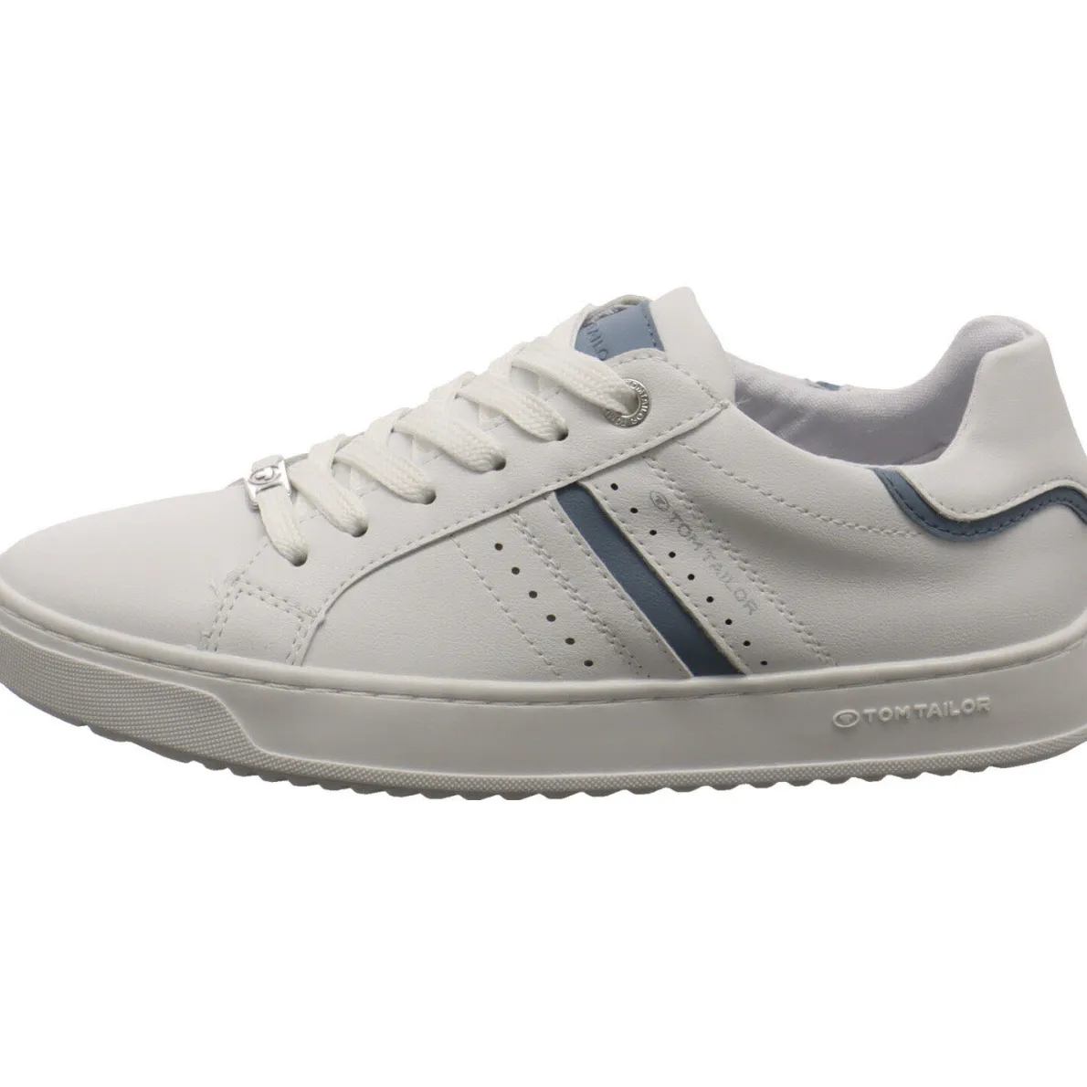 Das Obermaterial aus Kunstleder in Weiß, ist an den Seiten mit der Tom Tailor Markenaufschrift in Silber versehen. Einsätze an der Ferse, auf der Zunge und an der Außenseite in hellem Blau, machen den Schuh zu einem tollen Eyecatcher.