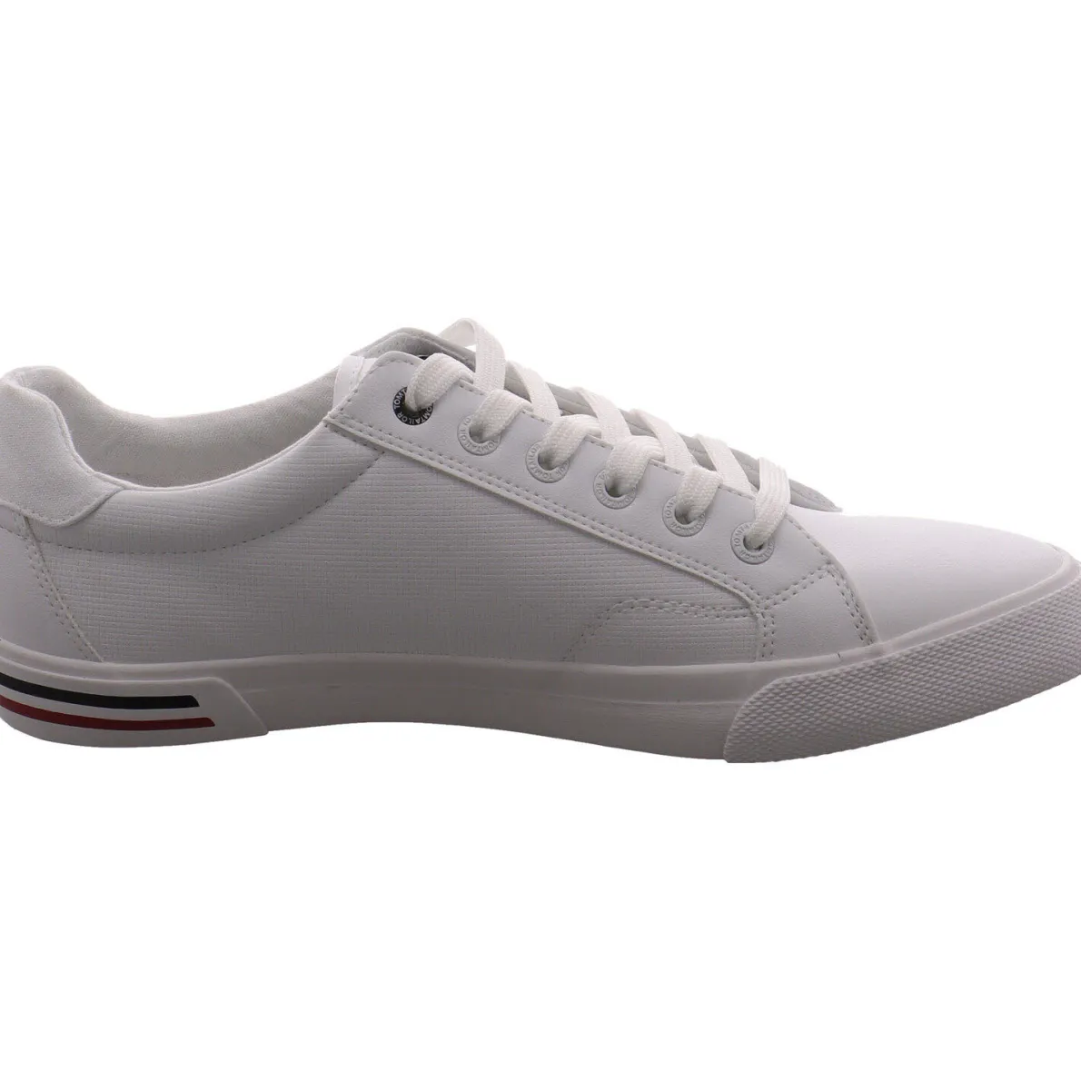 Dieser Herren Sneaker in Weiß aus dem Hause Tom Tailor wird Sie perfekt durch den Alltag begleiten. Er begeistert durch seinen sportlichen Look und wurde aus Kunstleder und Textil gefertigt. Das Obermaterial hat eine leichte Prägung und durch das dezente Design lässt er sich vielseitig kombinieren – perfekt für jedes Casual Outfit. Die helle Markenaufschrift an der Seite in Grau und der Einsatz in Blau an der Ferse, geben dem Schuh das gewisse Etwas und halten das Design dennoch sehr schlicht. Die Schnürsenkel ermöglichen eine perfekte Passform. Der Einsatz und das Innenfutter in Weiß am Schaft ist angenehm gepolstert und bietet einen optimalen Tragekomfort.