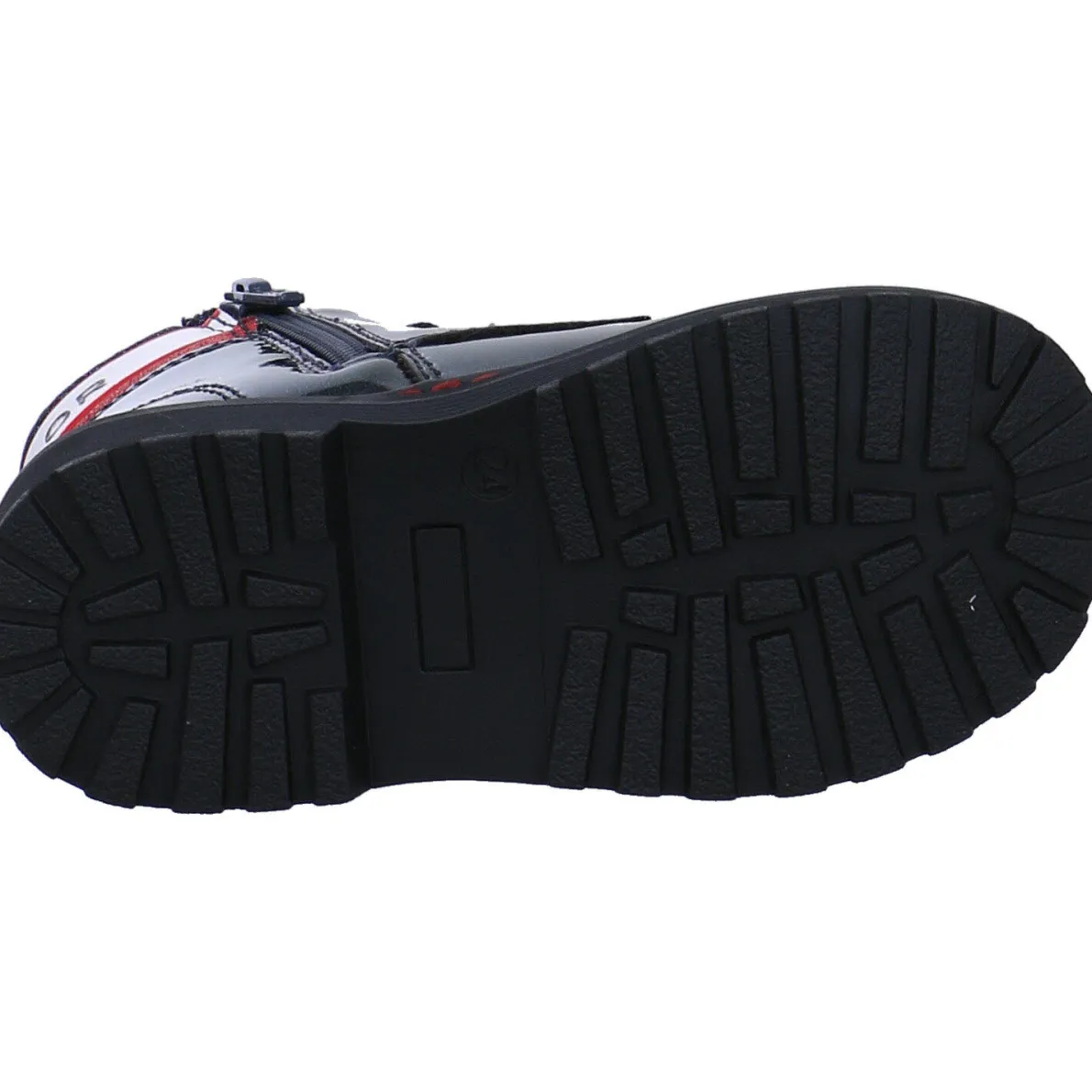 Gefertigt aus Kunstleder in Blau Lack Optik begeistert er jedes Mädchen durch sein modisches Aussehen. Highlights sind die Schnürsenkel mit Silberfaden und der Textilrand am Schaft mit Blau und Rot und mit Marken Logo.