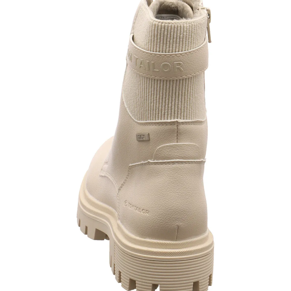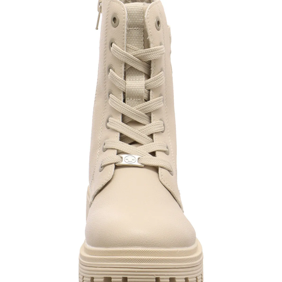 Gefertigt auseinem Mix aus Kunstleder und Textil in hellem Beige ist der Schaft mit einem Textil Einsatz versehen. Darüber wurde ein Riemen mit dem Markenlogo angebracht. Durch den seitlichen Reißverschluss ist der Einstieg ganz einfach. Mit der Schnürung kann er optimal an den Fuß angepasst werden.
