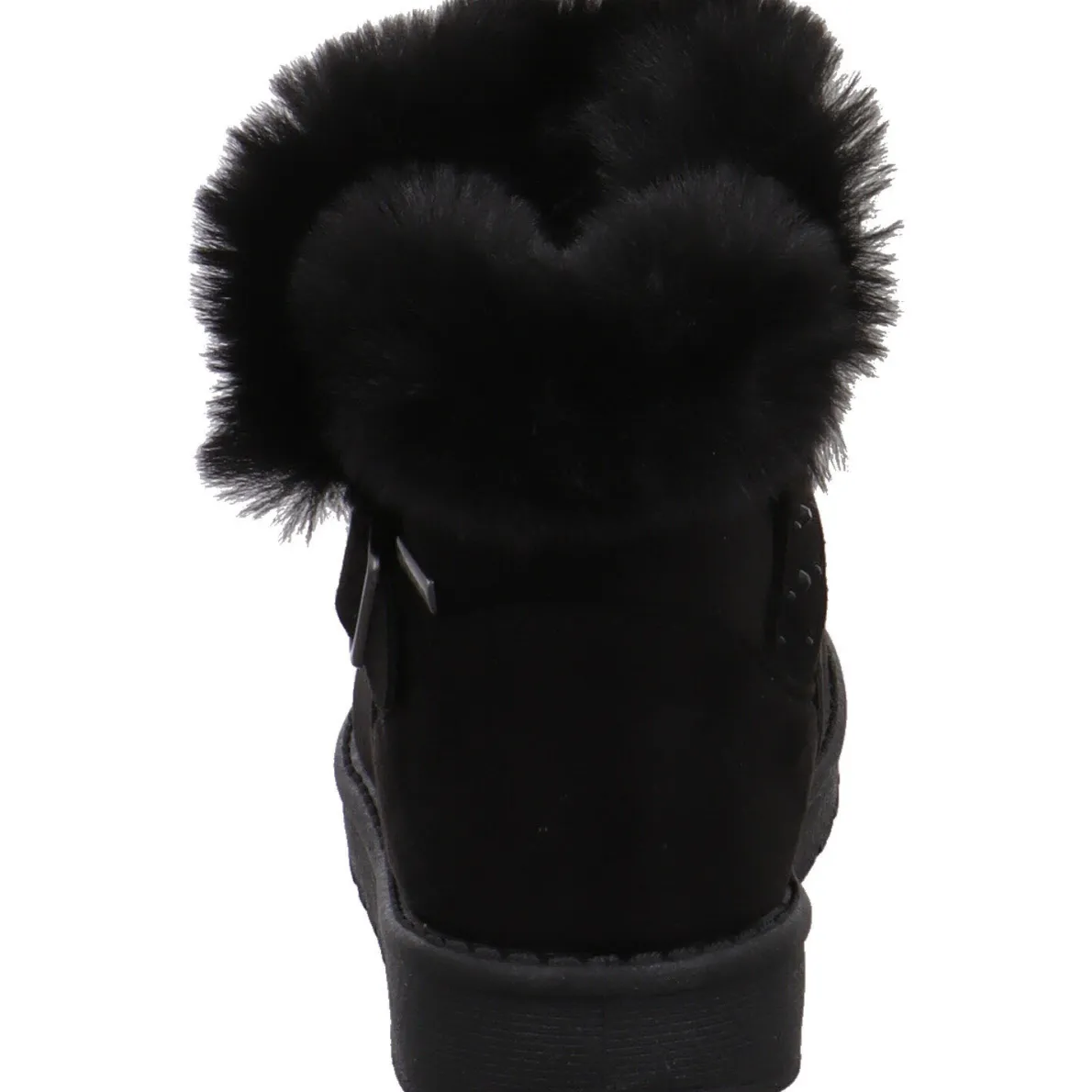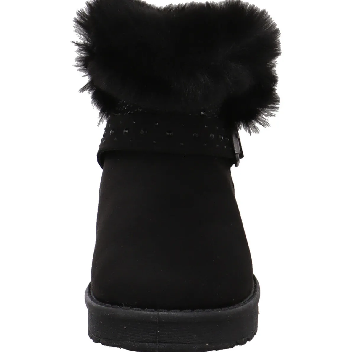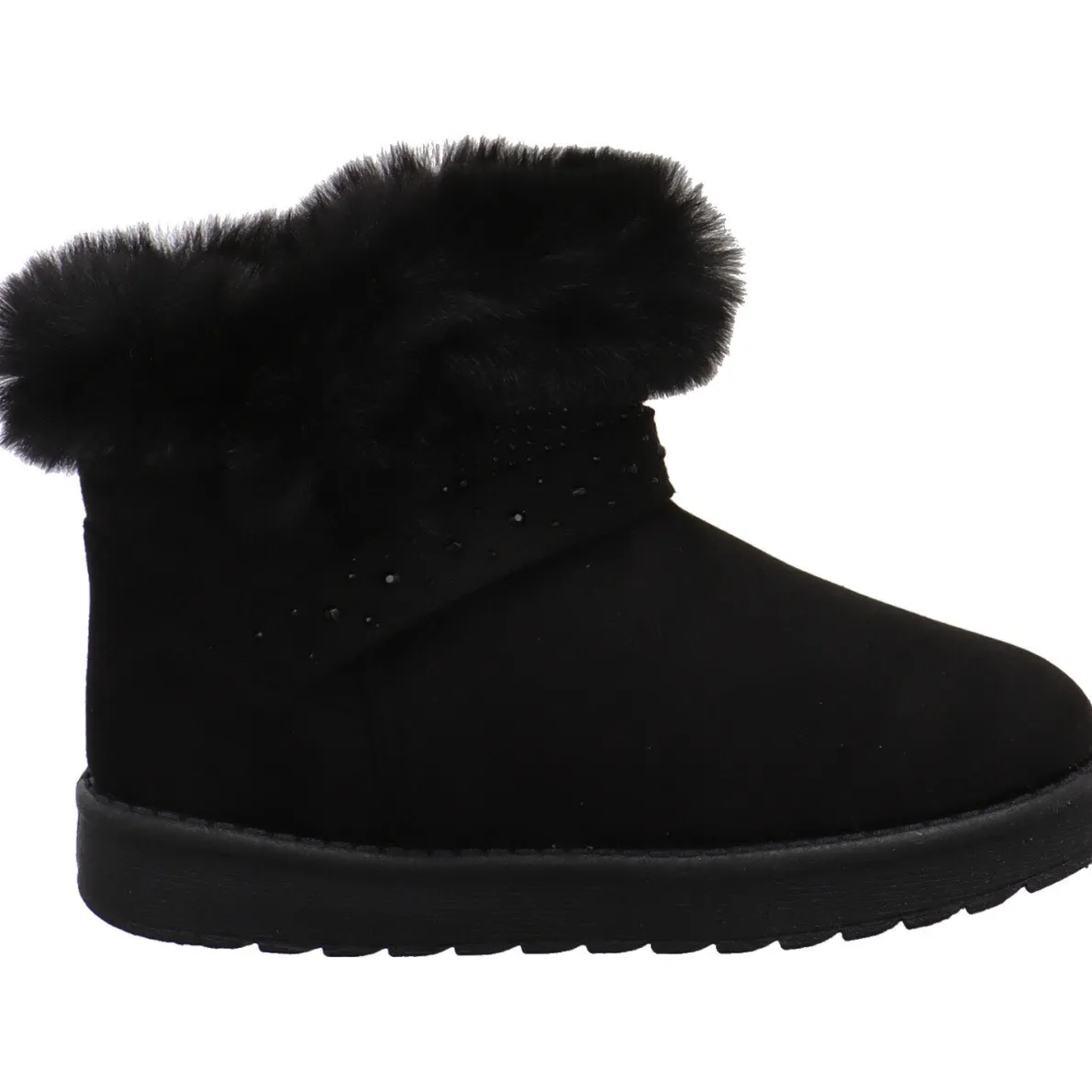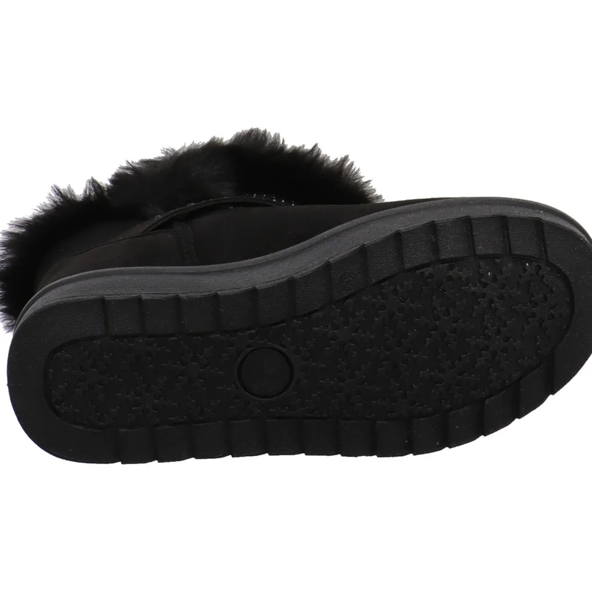 Er wurde aus Textil ist Schwarz gearbeitet und ist am Schaft mit einer Plüsch Kante verziert. Ein Zierriemen um den Knöchel mit Dornschnalle und kleine Glitzersteine, machen den Schuh zu einem echten Hingucker.