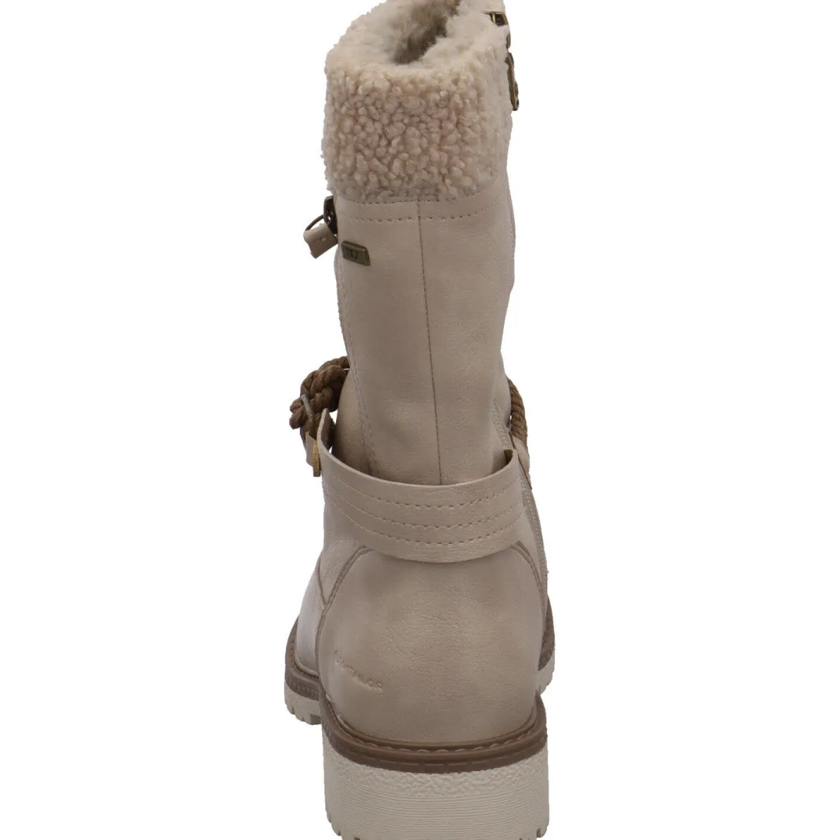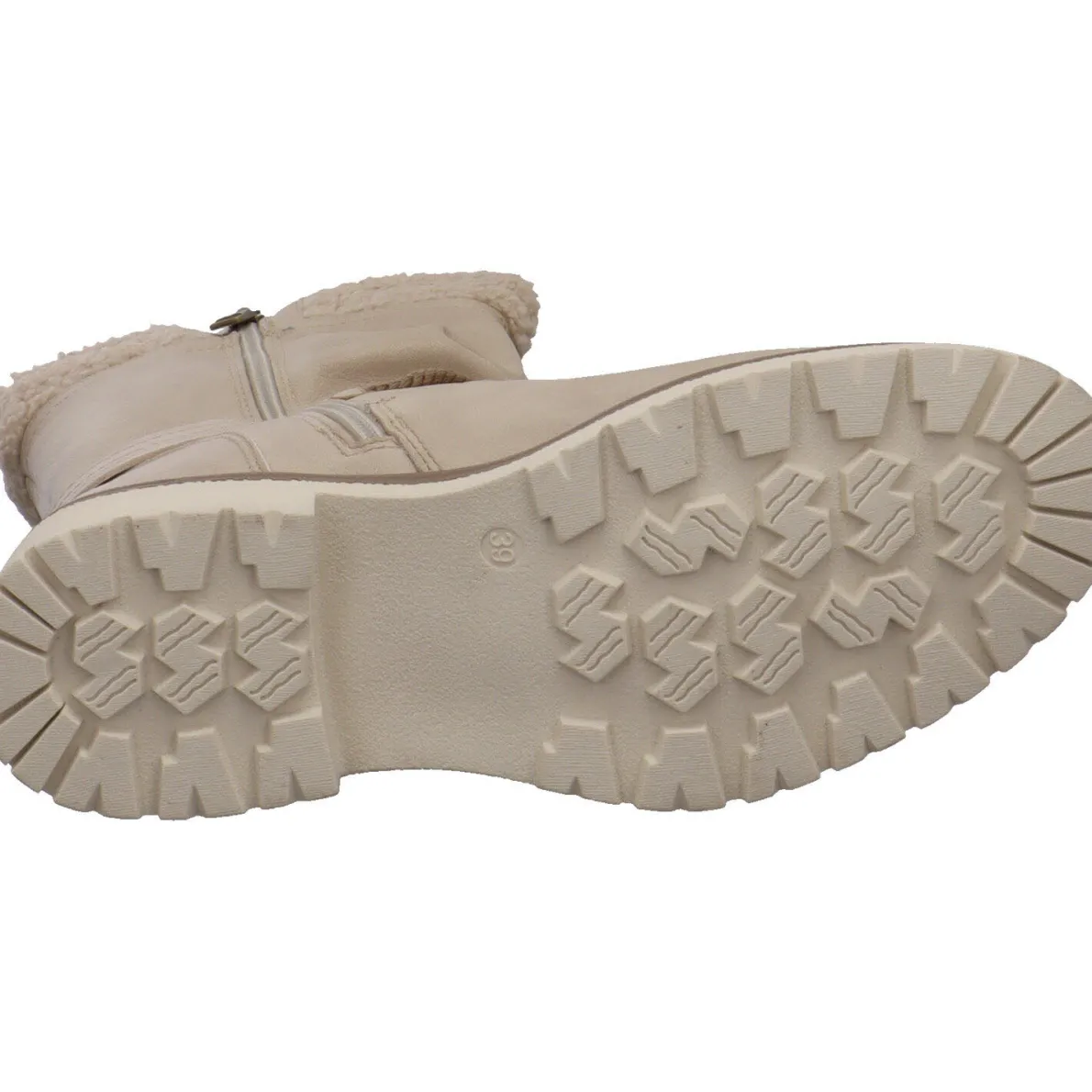 Das Obermaterial aus Kunstleder in Beige wurde mit im Antik Look gefertigt und ist so im angesagten Design. Der Schaftrand besteht aus Strick und ist so angenehm weich und ein echter Hingucker. Highlights sind der seitliche Zierreißverschluss und die Schnalle um den Knöchel, mit einer Zierkordel in Braun. Der Schuh ist außerdem mit der Tom Tailor Tex Ausstattung versehen, wodurch er wasserabweisend ist. Der Reißverschluss auf der Innenseite sorgt für einen leichten Ein- und Ausstieg.