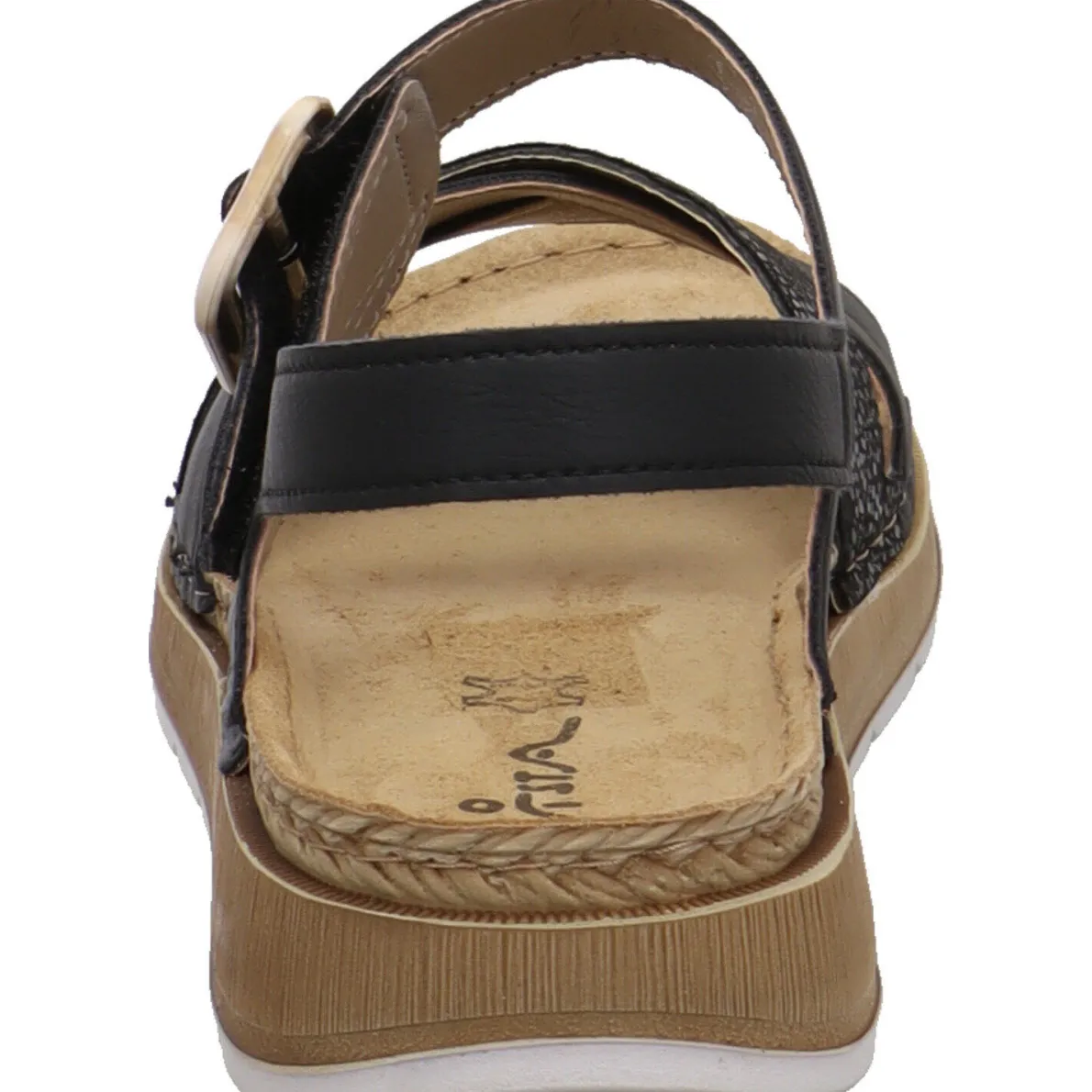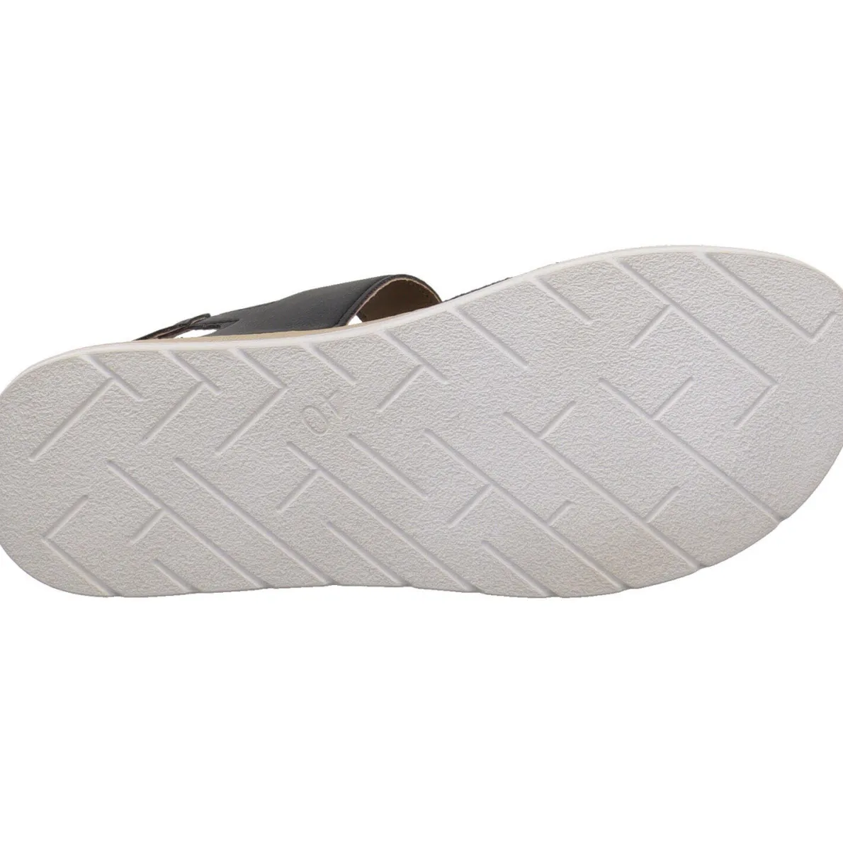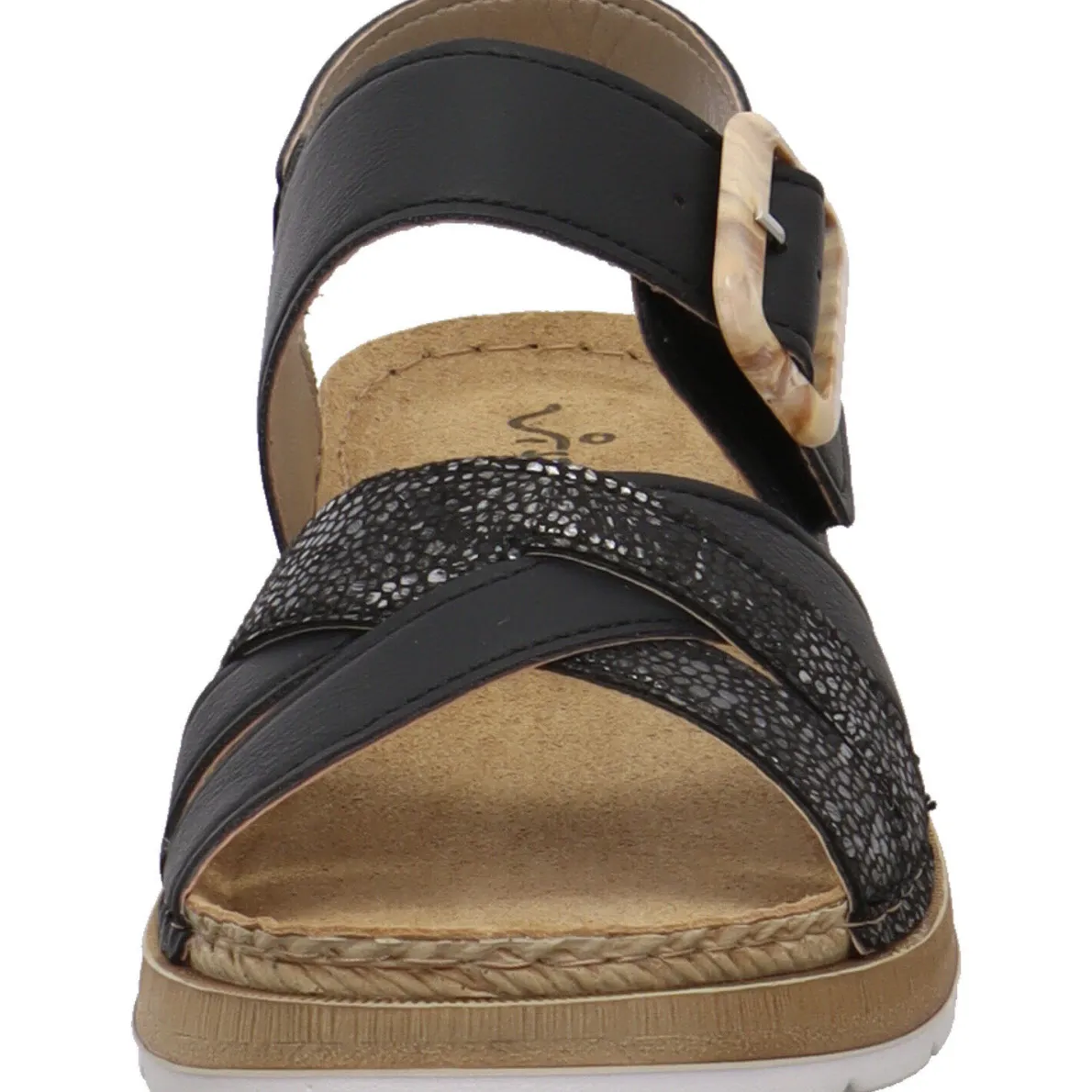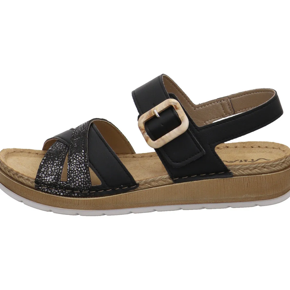 Modisch und bequem, begleitet dich diese schöne Damen Sandale aus den Hause Vista. Die über Kreuz gesetzten Riemen in Schwarz, sind mit einem schimmernden Muster verziert. Der Köchelriemen mit Zierschnalle ist mit einem Klettverschluss gearbeitet, so kannst du den Schuh genau auf deine Bedürfnisse anpassen und der Einstieg ist leicht.