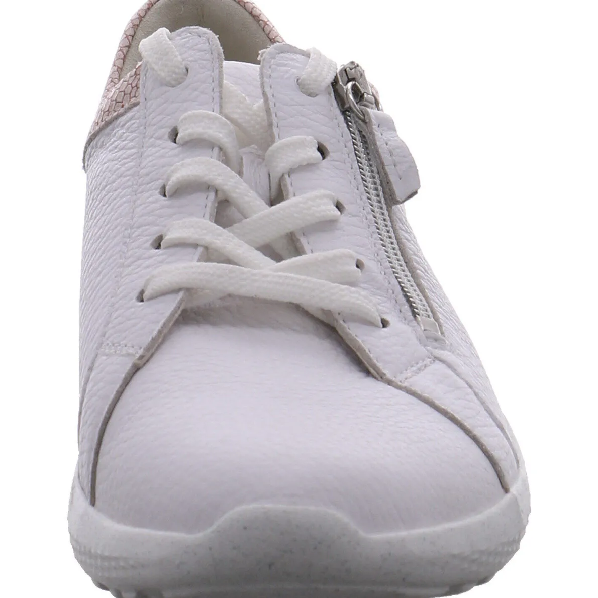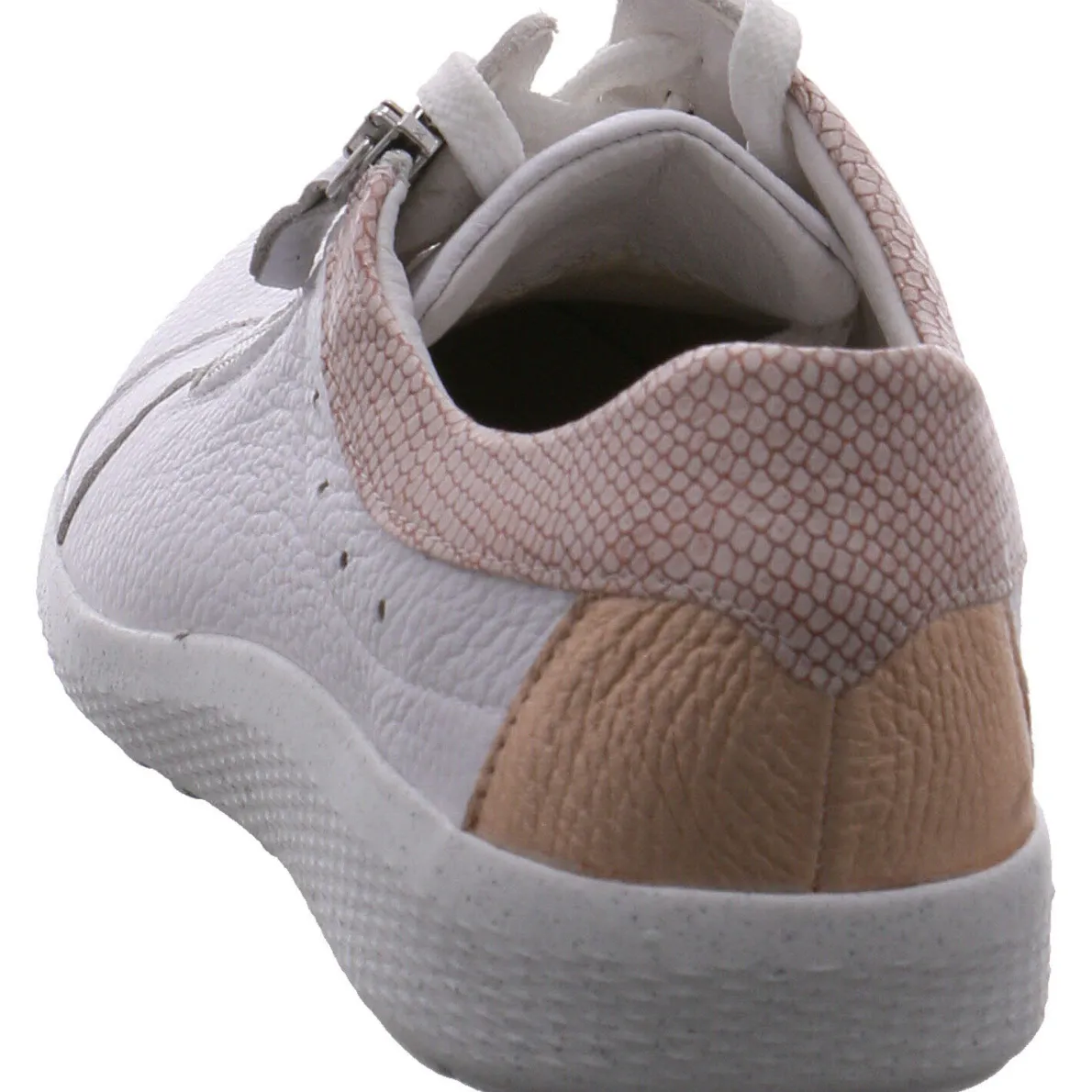 Das Obermaterial aus hochwertigem Echtleder in Weiß, wurde mit einen schönen Einsatz an der Ferse und am Schaft in Rosegold versehen und gibt dem Schuh seinen besonderen Look.