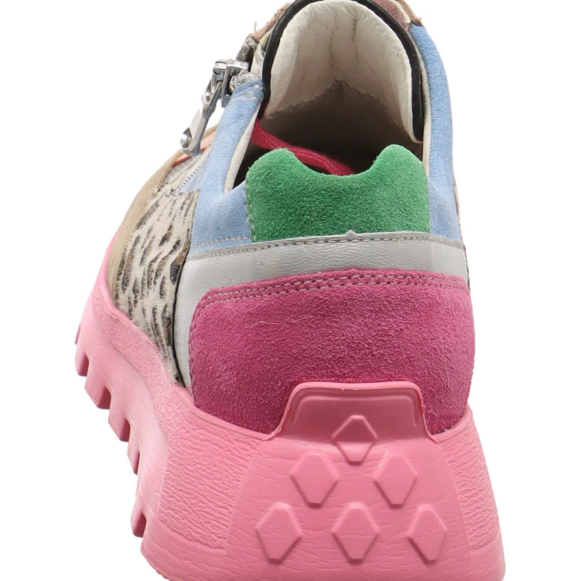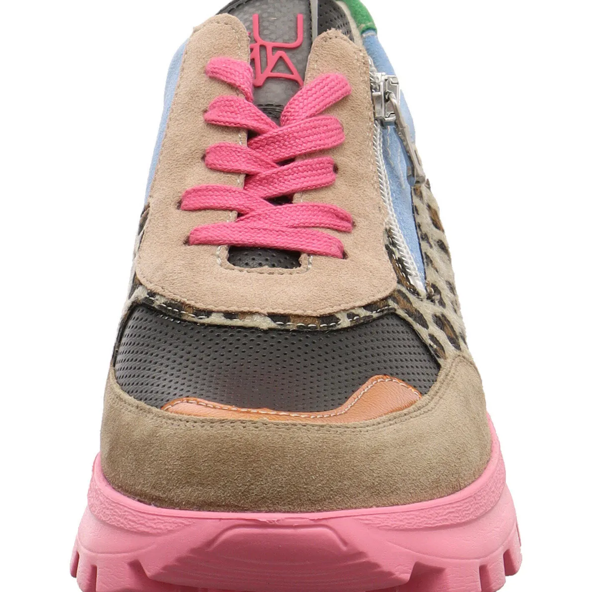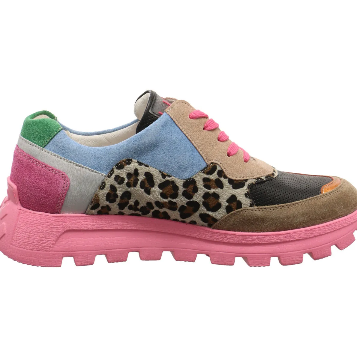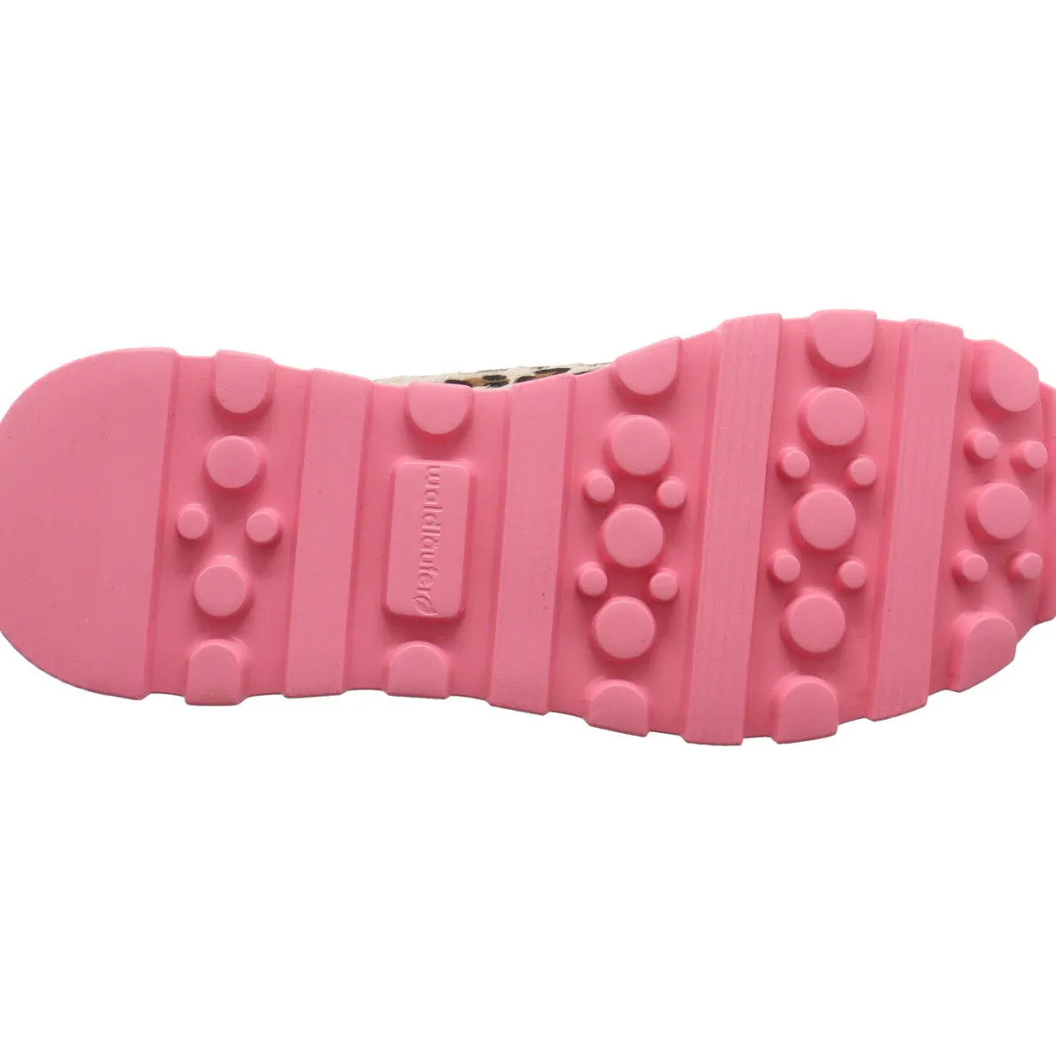 Mit dem komfortablem H-Ajala Damen Sneaker von Waldläufer bleiben keine Wünsche offen. Er wurde aus einem Mix aus hochwertigem Veloursleder, perforiertem Glattleder und Parts aus Textil gefertigt. Dieser absolute Trendsneaker überzeugt mit knalligen Farben und einem Einsatz in angesagtem Leoparden Muster. Einsätze in Blau, Grün, Beige, Pink und Braun in Veloursleder machen den Schuh zum Eyecatcher zu jedem Outfit. Der Einsatz in Schwarz und Orange aus Glattleder runden das Design gekonnt ab.