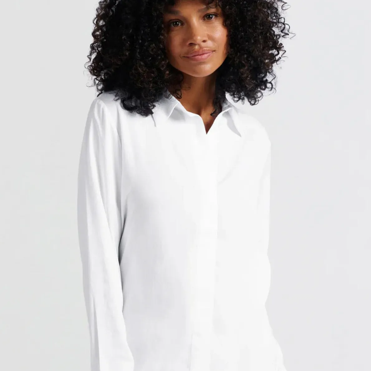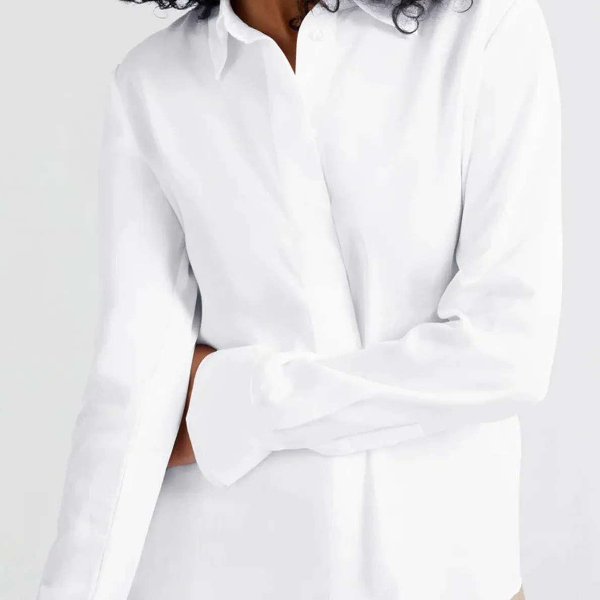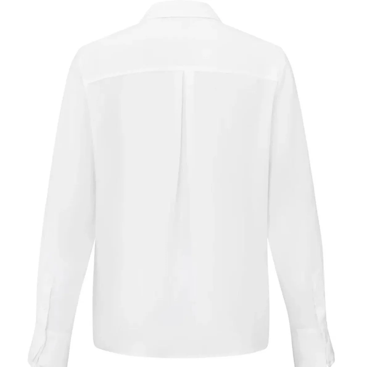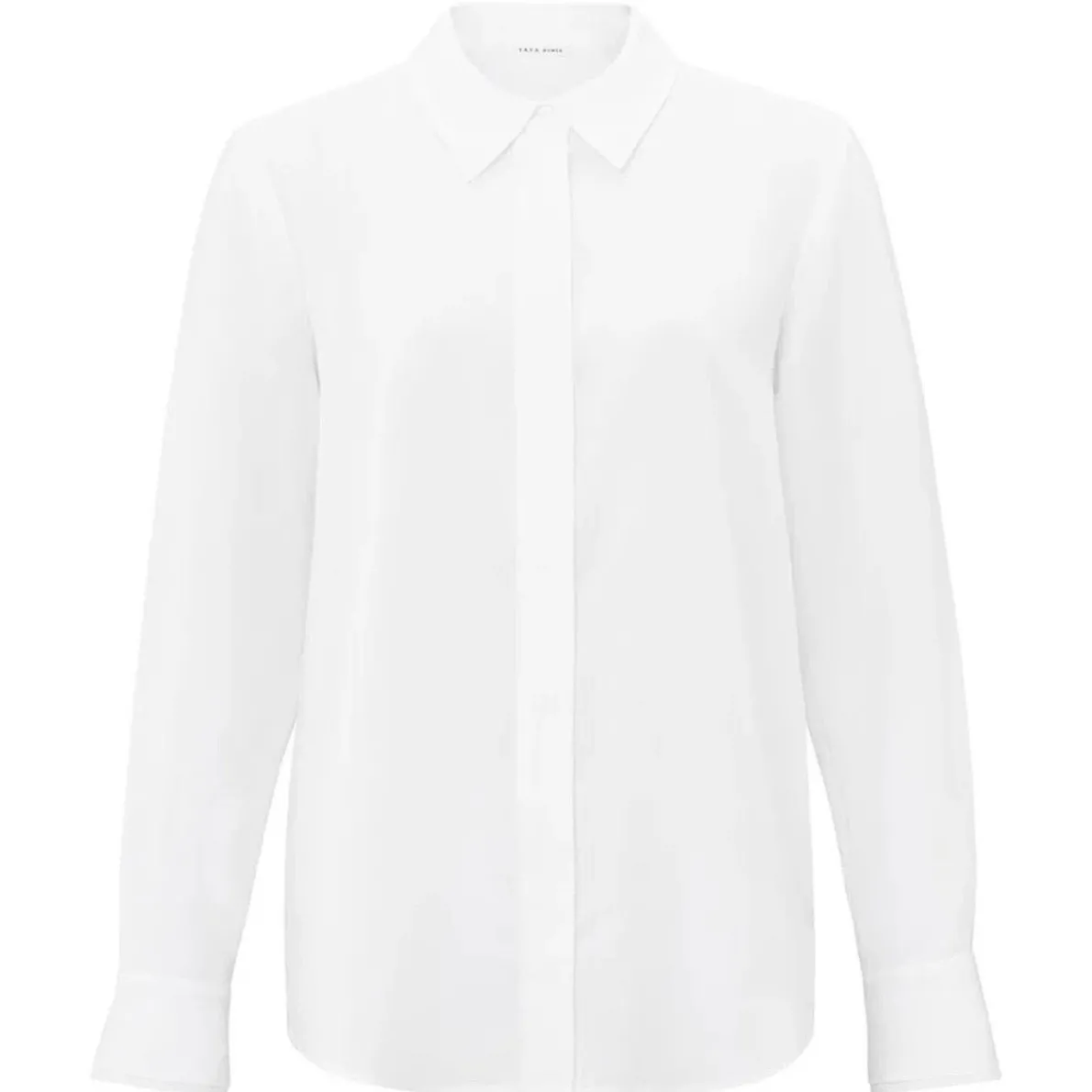 Sie wurde aus einem luftig leichten Material in Weiß gefertigt. Ein klassischer Kragen, lange ärmel mit einer eleganten Manschette und die verdeckte Knopfleiste, verleihen ihr einen edlen Look.