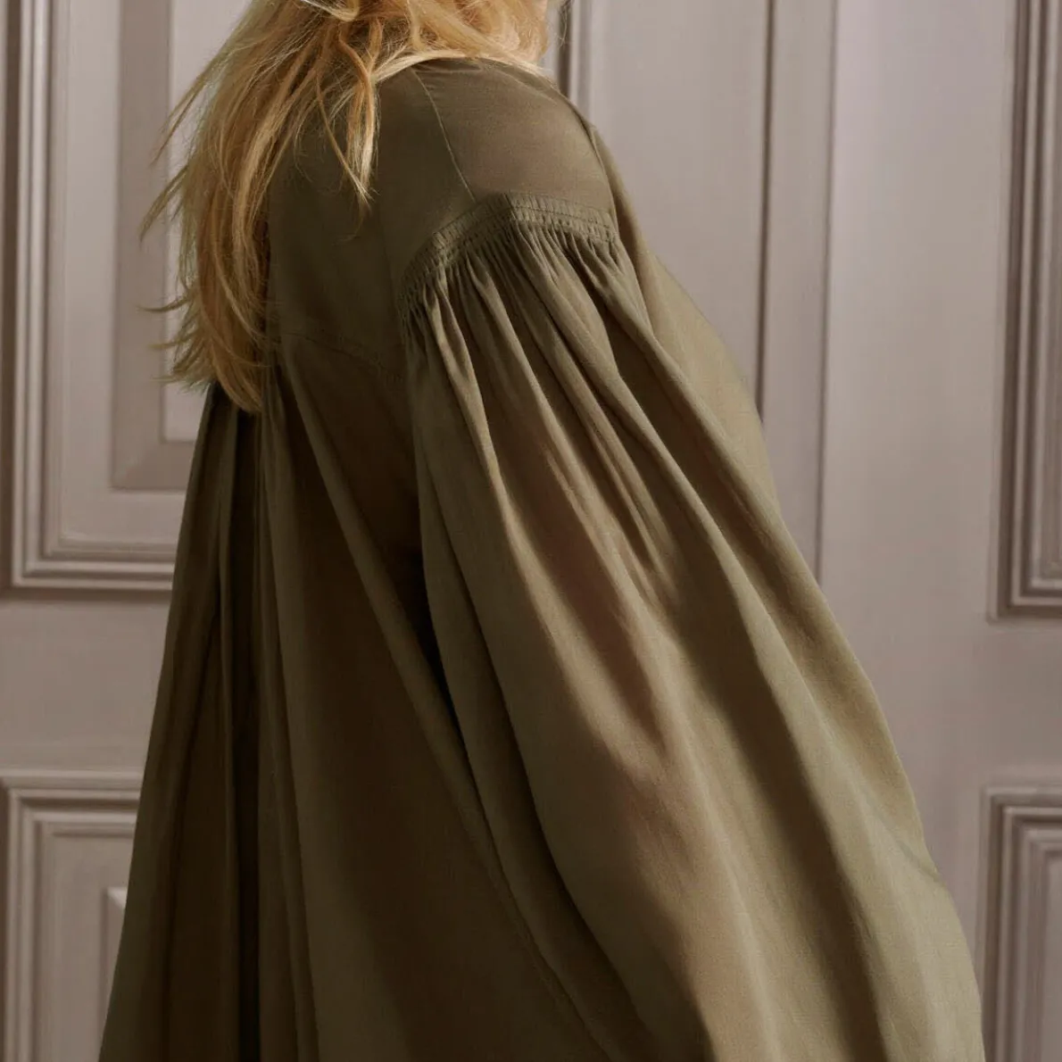 Das fließende Gewebe in Olive Grün, begeistert mit tollen Details. Wie dem V-Ausschnitt mit Knöpfen, den weiten langen Ärmeln und den Plisseedetails an Ärmeln und Rücken.