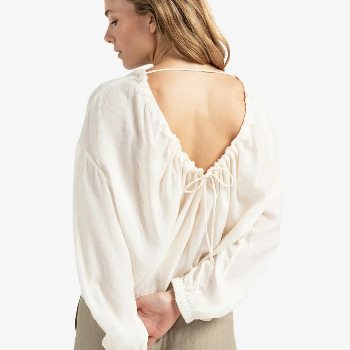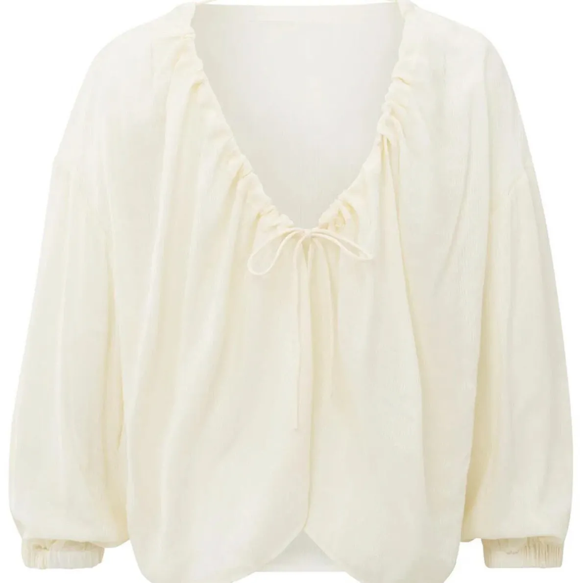 Sie ist aus einen luftigen Knitterstoff in Creme Weiß und mit einer Oversize Passform gearbeitet. Dadurch ist sie super auch an warem Sommer Tagen zu tragen. Die Bluse hat lange volluminöse Ballonärmel. Sie ist mit einem Rundhalsausschnitt versehen. Als besonderer Hingucker ist der obere Rücken fei und mit einem süßen Schleifendetail gearbeitet. Damit kannst du es ganz nach deinen Vorstellungen anpassen.
