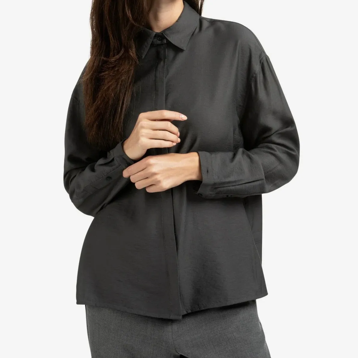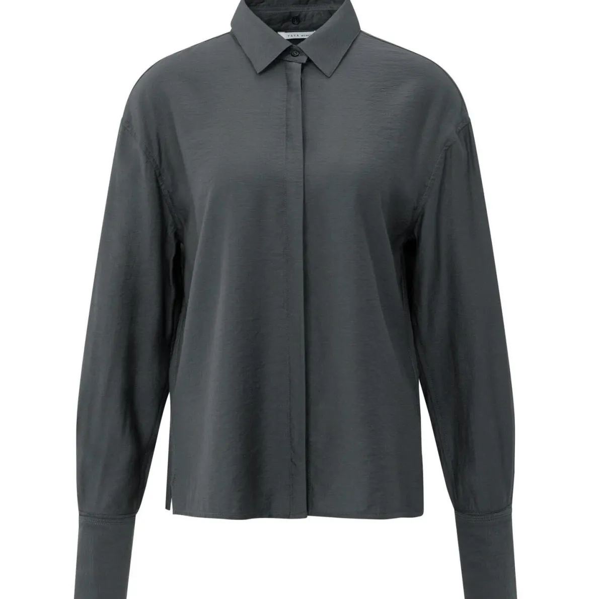 Diese ist jedoch mit zwei besonderen Funktionen ausgestattet. So kannst du den klassischen Kragen abnehmen und erhälst einen kleinen Stehkragen und auch die Manschetten der langen Ärmel lassen sich abnehmen. So veränderst du die Bluse komplett in ihrer Optik entsprechend dem Anlass. Sie verfügt außerdem über eine verdeckte Knopfleiste und ist am Rücken mit einer Pliseefalte gearbeitet. In Verbindung mit der lockeren Passform, hast du einen tollen Tragekomfort.
