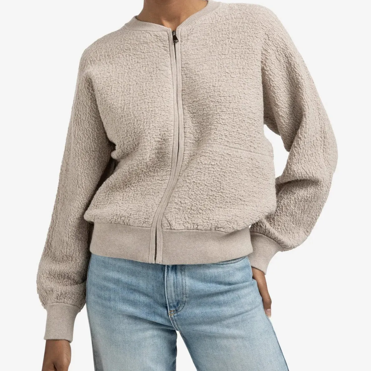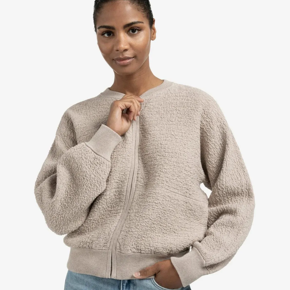 Sie begeistert uns durch ihre weiche Strick Haptik in Beige. Sie hat eine lockere Passform, typisch für diese Art von Jacke. Die langen Ärmel und der Bund haben Rippstrickbündchen und du kannst sie mit einem Reißverschluss schließen.